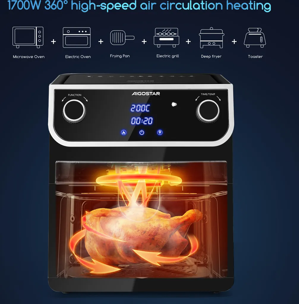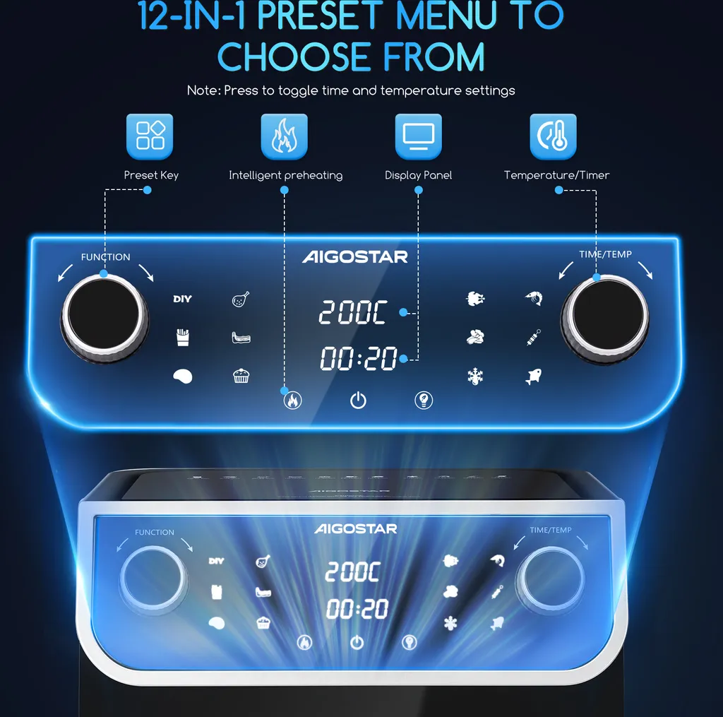 - [Multifunktionale Fritteuse] Aigostar Nicht-Fritteuse ist mit zwei unabhängigen Knöpfen und zwei unabhängigen LED-Anzeigen ausgestattet, wird geliefert mit 12 Programmvoreinstellungen, Ein-Tasten-Kochen intelligente Vorheizen, sie ist mit rutschfesten Füßen uns Kabelrolle ausgestattet,