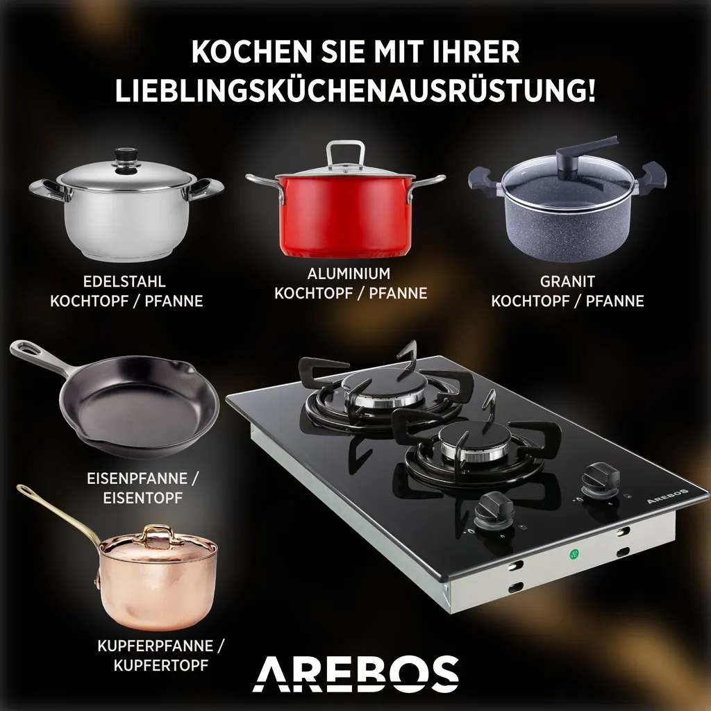 Mit dem Gaskochfeld von AREBOS sind Sie bei der Auswahl Ihrer Kochutensilien maximal flexibel. Ob Sie nun Töpfe oder Pfannen aus Edelstahl, Aluminium, Granit, Kupfer oder Eisen zum Kochen nutzen ist ganz Ihnen überlassen.