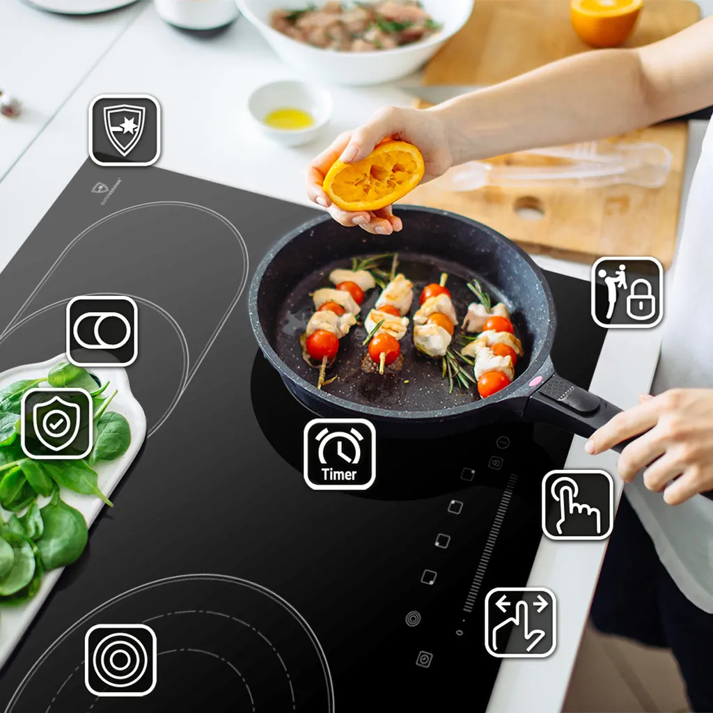 Falls eine Kochzone noch heiß ist, werden Sie von einer LED-Lampe davor gewarnt. Das Gerät ist mit einer Kindersicherung ausgestattet. Die Breite des Kochfelds beträgt 59cm.