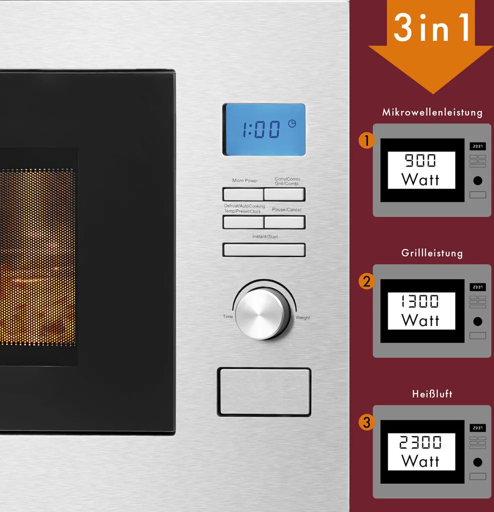 - Die Bomann 3in1 Einbaumikrowelle mit Grill und Heißluft eignet sich perfekt zum Grillen, Auftauen und Erwärmen von verschiedenen Speisen