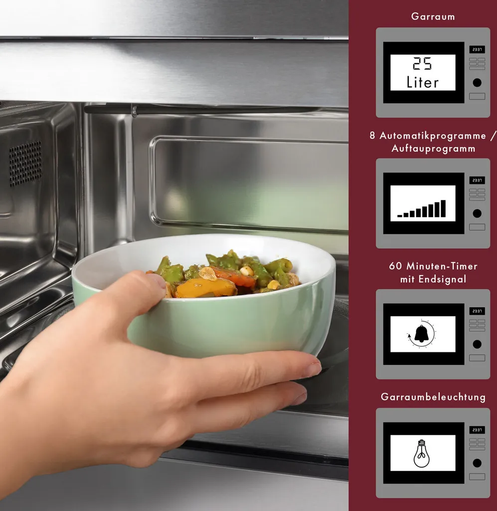 - Mit Hilfe der 8 Automatikprogramme ermöglicht Ihnen die Edelstahl-Einbau-Mikrowelle ein stressfreies Kochen. Zusätzlich lassen sich die Grill- und Mikrowellen- bzw.