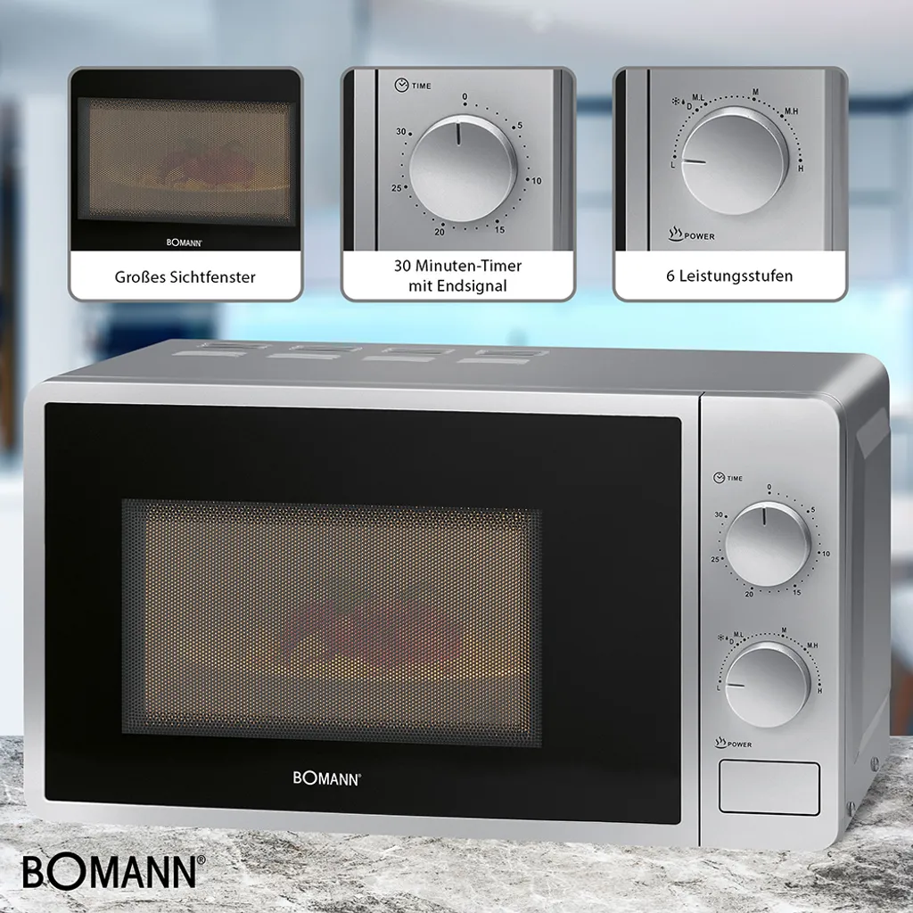 Bomann MW6014CB Mikrowelle silber , 700 Watt Mikrowellenleistung , 20 ltr. Garraum , 6 Leistungsstufen , Drehteller, Ø ca. 24,5 cm , 30 Minuten-Timer mit Endsignal , Garraumbeleuchtung , Großes Sichtfenster , Gewicht 10,1 kg , Gerätemaße: B 45,0 x H 25,5 x T 34,0 cm
