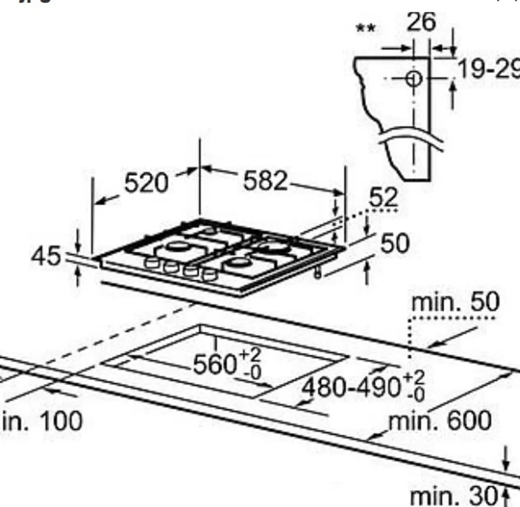 Maße des Kochfeld: 45 x 582 x 520 mm
