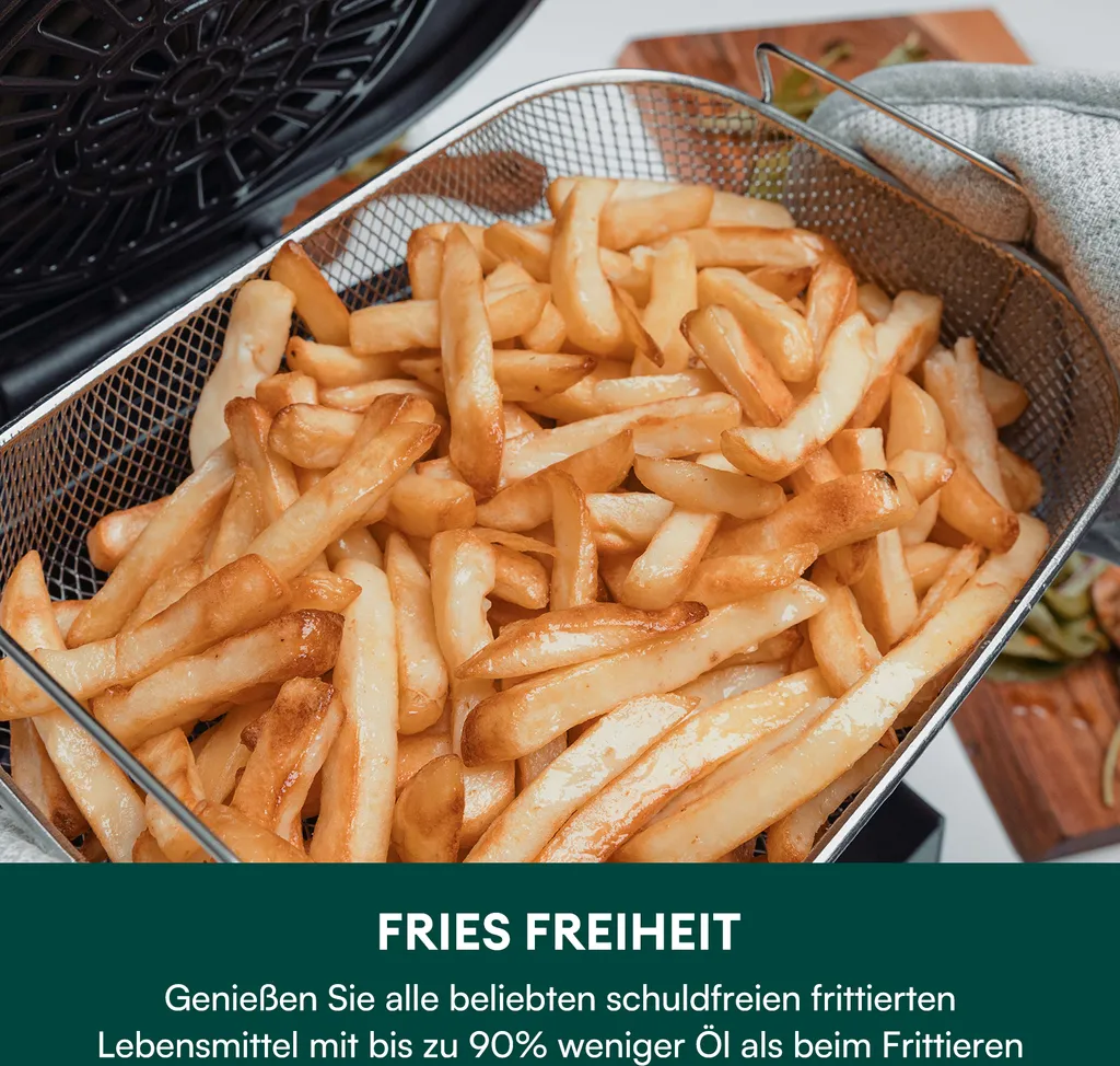 6L extra große Kapazität: Grill & Heissluft-Fritteuse mit einem extra großen Fassungsvermögen und auch mit einem 4-Liter-Netzkorb und Backblech ausgestattet, ist es perfekt für große Familienfeiern