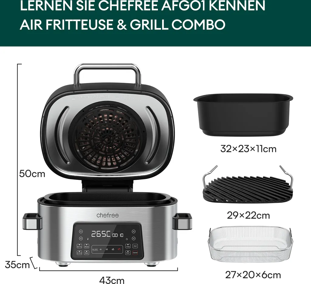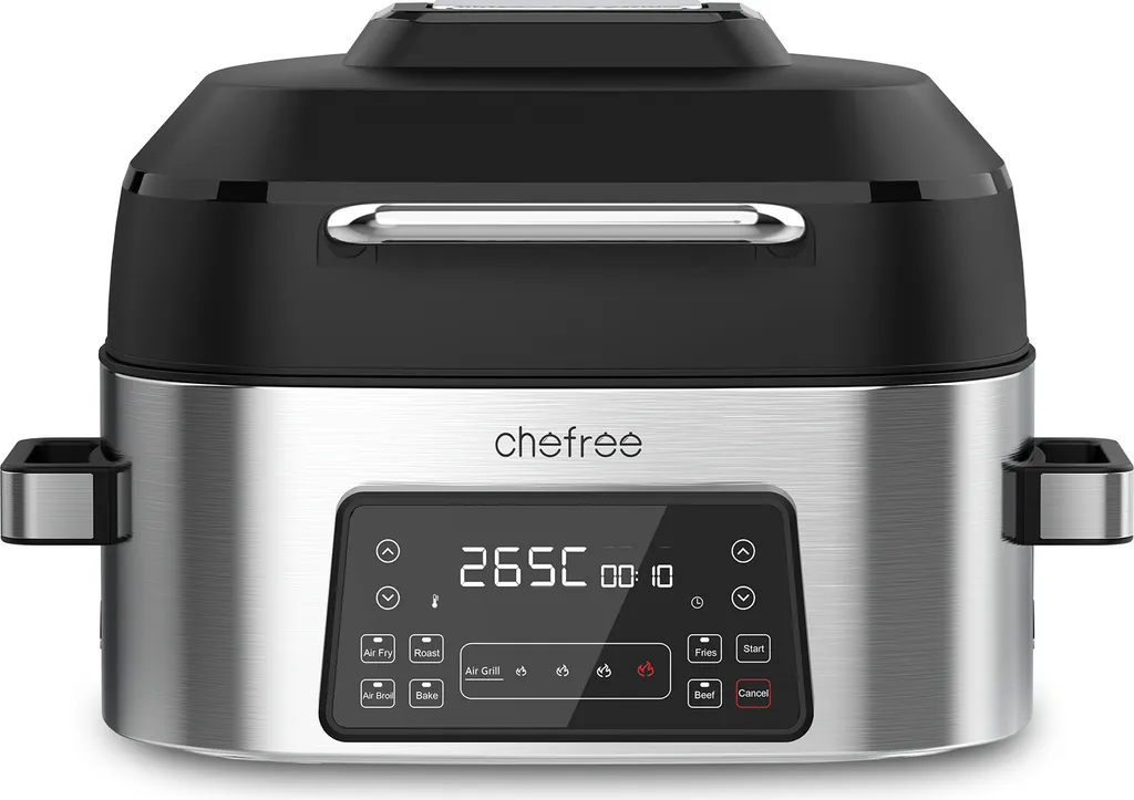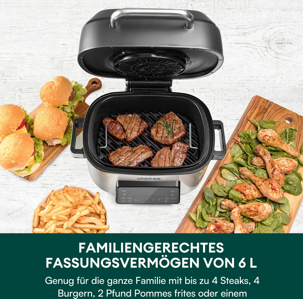 8-IN-1 INTELLIGENTES KOCHEN: Die CHEFREE AFG01 Heißluftfritteuse & Grill hat 8 Kochfunktionen, Sie wählen eine Speiseart und genießen Ihre Mahlzeit auf Knopfdruck, Es ist die beste Wahl für Ihre einfache und schnelle Küche.