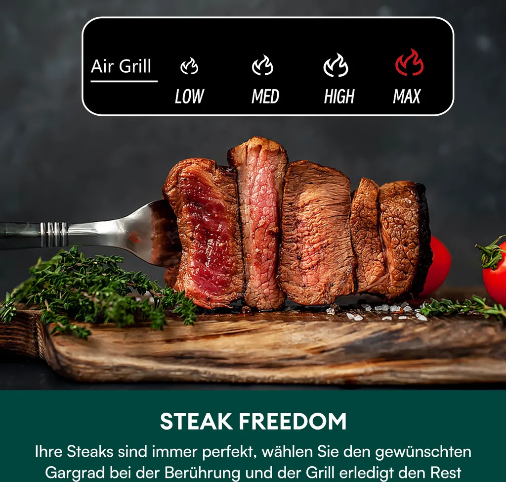 4-Gang GRILL Modus: Diese Funktion eignet sich zum Braten von verschiedenen Fleischsorten (Rind, Huhn, Schwein, Lamm, Fisch usw.), während die 4 Heizstufen und die es Ihnen ermöglichen, die Hitze leicht zu regulieren, um verschiedene Garstufen zu erreichen.(Roh, Medium, Gekocht)