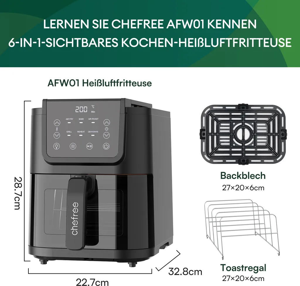 Visuelles Fensterdesign: Die Heissluftfritteuse AFW01 nimmt ein visuelles Fensterdesign an, Benutzer können Lebensmittel jederzeit anzeigen, ohne die Kompaktfriteusen zu öffnen, und den gewünschten Lebensmitteleffekt anpassen