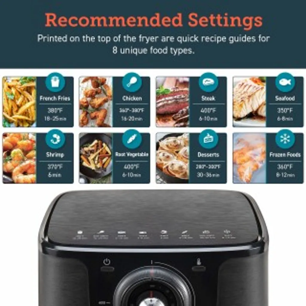 Genießen Sie Ihre Lieblingsspeisen mit 30 Rezepten für jede Mahlzeit. Die 8 Schnellrezepte auf der Oberseite der Heißluftfritteuse erleichtern und beschleunigen das Kochen.