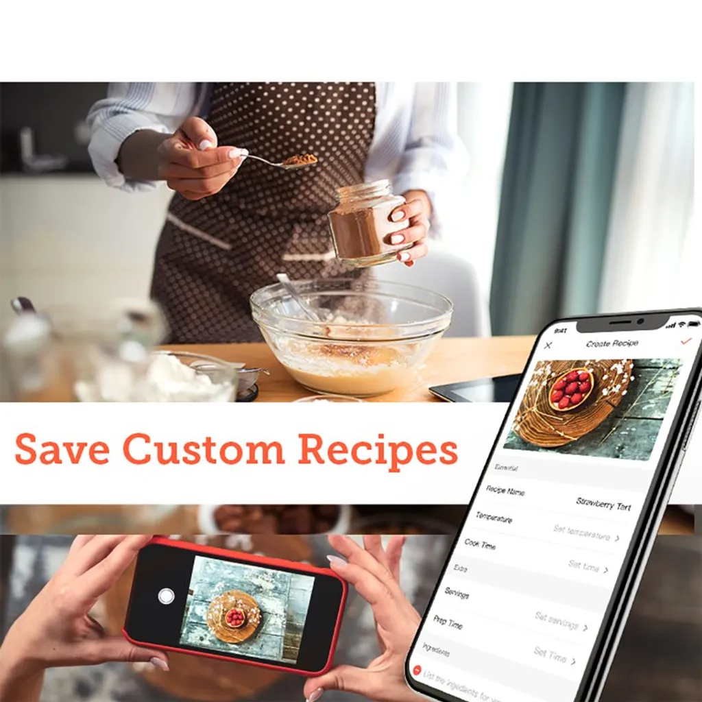 Steuern Sie Ihre Heissluftfritteuse über die VeSync-App fern. Genießen Sie die Kontrolle von überall, um den Fortschritt Ihrer Mahlzeiten zu planen, anzupassen und zu überwachen. Verschaffen Sie sich einen Vorsprung beim Abendessen, indem Sie die Kochzeiten bis zu 4 Stunden im Voraus planen. Diese intelligente Luftfritteuse benötigt ein 2,4-GHz-WLAN-Netzwerk, um mit der VeSync-App arbeiten zu können.