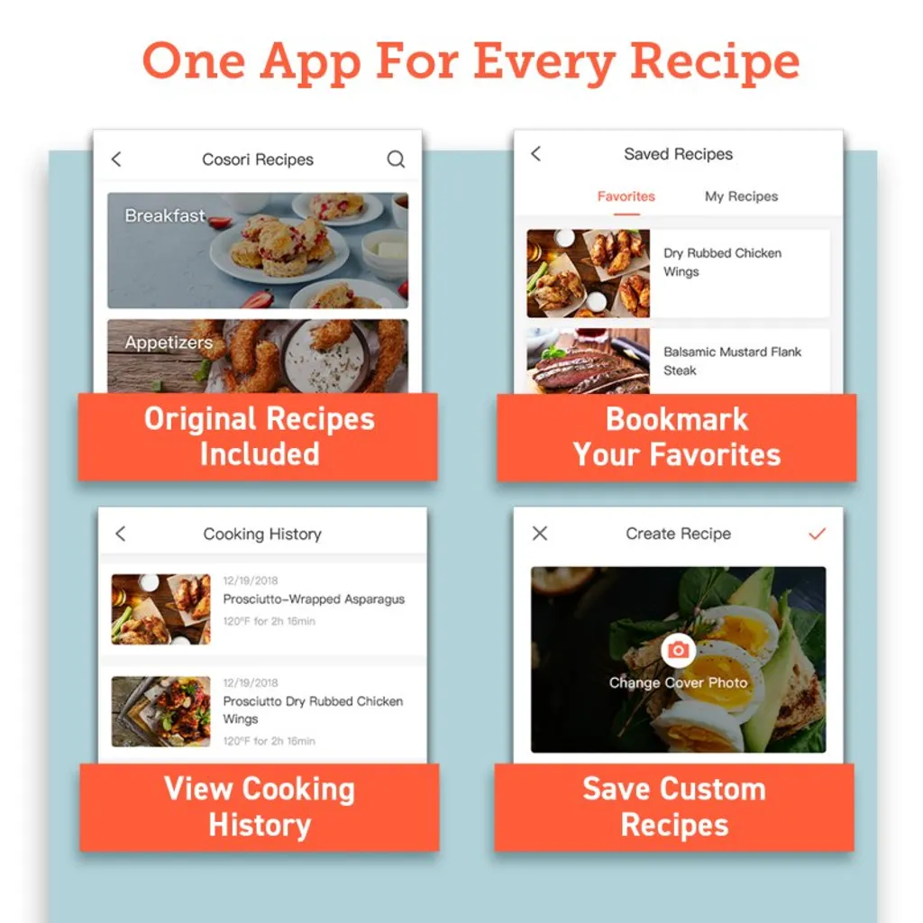 Suchen Sie in der VeSync-App nach über 100 vorprogrammierten Originalrezepten, um loszulegen. Wöchentlich werden neue Rezepte hinzugefügt. In unserer Online-Community finden Sie noch mehr Rezepte von Cosori-Nutzern. Darüber hinaus können Sie Ihre eigenen Rezepte anpassen und das entsprechende Programm in der App speichern. Und Sie erhalten auch als Zugabe ein Rezeptbuch(DE/FR/IT/ES) mit originellen, köstlichen und handlichen Rezepten, welche Sie zu Hause nachkochen können.