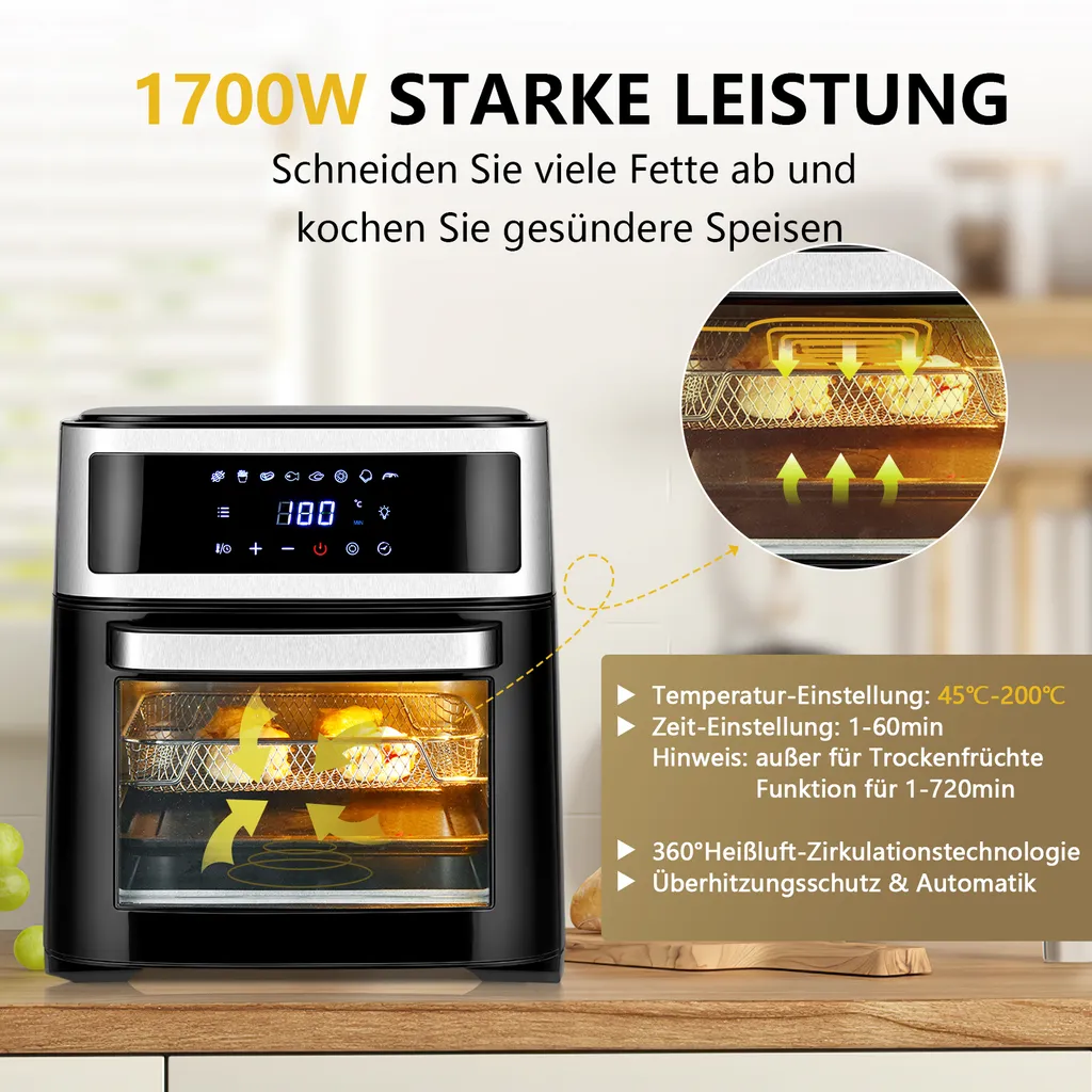 Durch die 360° Luftzirkulation und die Leistung von 1700W werden die Zutaten optimal zubereitet. Die Temperatur kann in einem Bereich von 45°C – 200°C eingestellt werden, wodurch das Essen wunderbar gelingt.