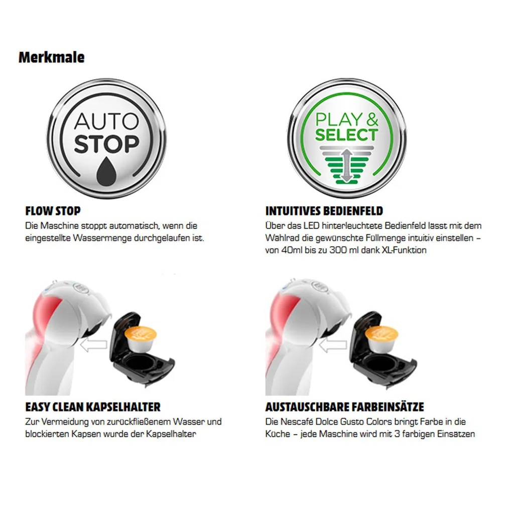 Kaffee ist nicht nur Schwarz. Dolce Gusto – Kaffeevielfalt mal anders erleben: Dank der intelligenten Kapseltechnologie wird der Druck, der in der Kapsel herrscht, passend zu jedem Getränk automatisch reguliert. Dadurch erreichen Sie beste Ergebnisse bei der Getränkezubereitung. Heute Rot, morgen Blau, übermorgen Grün – die NESCAFÉ Dolce Gusto Colors bringt Schwung in die Küche und ist alles andere als eine gewöhnliche Kaffeemaschine. Das Multitalent passt sich dank austauschbarer Farbeinsätze der Stimmung und der Kücheneinrichtung ihrer Besitzer ganz einfach an. Mit dem 1,0 Liter großen, abnehmbaren Wassertank lässt sich ein Getränk nach dem anderen zaubern. Über das mit LEDs hinterleuchtete Bedienfeld lässt sich die gewünschte Füllmenge des Lieblingsgetränks intuitiv einstellen – von 40 ml bis zu 300 ml, dank XL-Funktion.