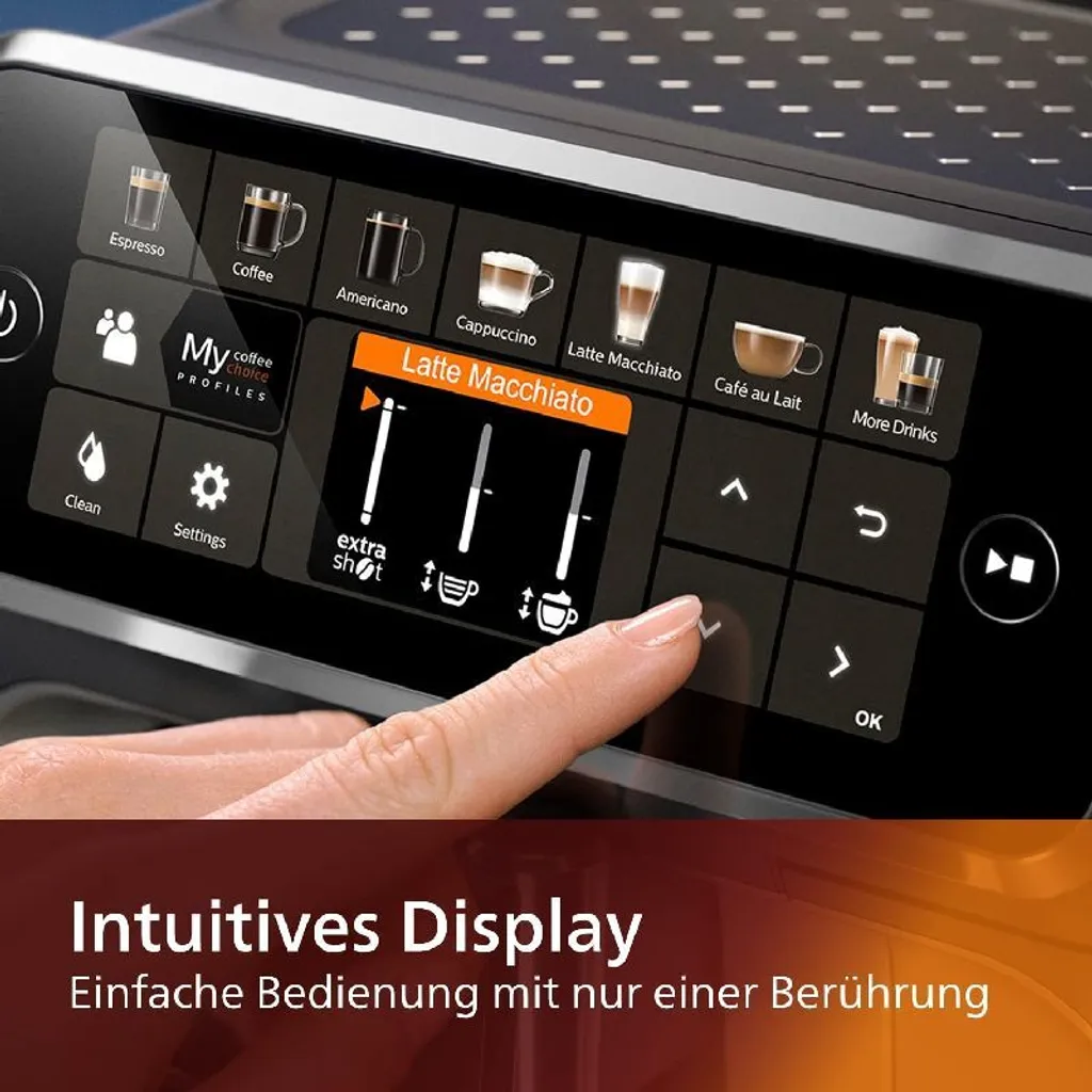 Besondere Merkmale: 12 leckere Kaffeespezialitäten, LatteGo Milchsystem, Intuitives Display, Kaffee Customizer, Benutzerprofile, Extra Shot-Funktion, Optimal in Temperatur und Aroma, 12-stufige Mahlwerkeinstellung, Scheibenmahlwerk aus 100 % Keramik, leicht zu reinigen, herausnehmbare Brühgruppe, Premium-Design, anpassbare Mahloptionen, 5 einstellbare Stärken des Kaffees, Milchtank, einstellbare Kaffeeauslaufhöhe, 85 – 145 mm, Heißwassersystem, 3 Termperatureinstellungen, spülmaschinenfeste Teile, verstellbare Füllmenge von Kaffee und Milch, Kaffeepulver-Funktion, doppelte Tasse, Aromaschutzdeckel, Eco-Einstellung, Fassungsvermögen des Kaffeesatzbehalters: 12 Portionen, Wasser- und Kaffeesatzbehälter: Zugriff von vorne.
