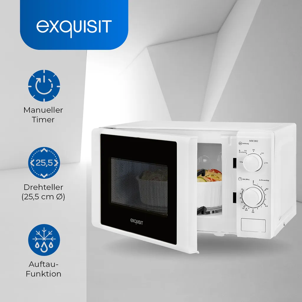 Die MW 802 mit der Gehäusefarbe Weiß ist eine Mikrowelle der Marke Exquisit und begeistert mit einer Vielzahl von Funktionen. Sie besitzt eine Front in der Farbe Weiß/Glas und bietet einen Garraum von 20 Liter. Durch Ihre freistehende Bauform kann die Mikrowelle überall einfach positioniert werden. Sie benötigt nur einen Stromanschluss. Die Abmessungen des Gerätes betragen 25,8 x 43,9 x 34,0 cm (Höhe/Breite/Tiefe). Die Gesamtleistung von 700 W ist unterteilt in 5 Stufen bietet Ihnen maximale Flexibilität in der Zubereitung und beim Aufwärmen Ihrer Mahlzeiten. Dank des integriertem Timers (manuell) haben Sie die Restlaufzeit Ihrer Programme jederzeit im Blick. Durch die komfortable Innenbeleuchtung behalten sie Ihre Speisen fortlaufend im Blick. Damit Ihre Speisen optimal zubereitet werden, sorgt der integrierte Drehteller mit einem Durchmesser von 25,5 cm für genügend Platz. So werden Ihre Speisen gleichmäßig erwärmt. Wenn Sie eine zuverlässige und leistungsstarke Mikrowelle suchen, ist die MW 802 von Exquisit genau richtig für Sie.