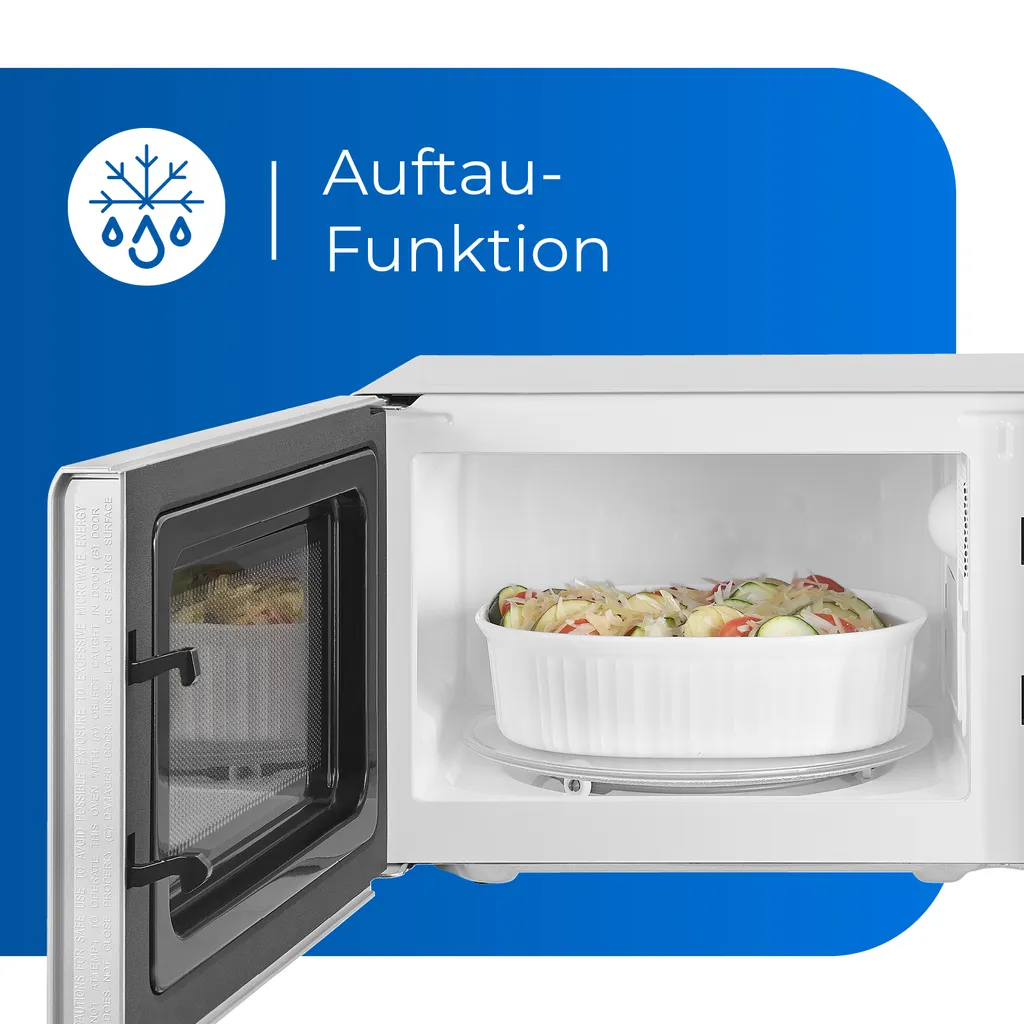 Die MW 802 G Silber mit der Gehäusefarbe Silber ist eine Mikrowelle aus dem Hause Exquisit und begeistert mit vielfältigen Funktionen. Sie besitzt eine Front in der Farbe Silber/Glas und bietet einen Garraum von 20 Liter. Durch Ihre freistehende Bauart kann die Mikrowelle überall problemlos aufgestellt werden. Sie braucht nur einen Stromanschluss. Das Gerät hat die Abmessungen 25,8 x 43,9 x 34,0 cm (Höhe/Breite/Tiefe). Die Mikrowelle liefert eine Gesamtleistung von 700 W, die Sie in 5 Stufen regeln können. So sind Sie für jede Gegebenheit bestens vorbereitet. Die Grillfunktion sorgt mit maximal 1000 W dafür, dass Ihre Speisen knusprig und kross werden. Hierdurch wird das Aufbacken oder Bräunen von Speisen zum Kinderspiel. Die Mikrowelle besitzt wie erwartet einen Timer (manuell). Mit diesem haben Sie die Restzeit Ihres Programmes immer im Blick. Durch die komfortable Innenbeleuchtung behalten sie Ihre Speisen fortlaufend im Blick. Damit Ihre Speisen optimal zubereitet werden, sorgt der integrierte Drehteller mit einem Durchmesser von 25,5 cm für genügend Platz. So werden Ihre Speisen gleichmäßig erwärmt. Wenn Sie eine verlässliche und leistungsstarke Mikrowelle suchen, ist die MW 802 G Silber von Exquisit genau richtig für Sie.