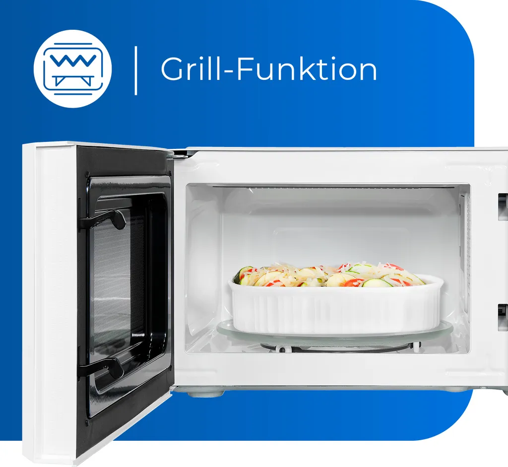 Die MW 717-070 G mit der Gehäusefarbe Weiß überzeugt als Mikrowelle mit vielfältigen Funktionen. Sie verfügt über 5 Leistungsstufen und bietet einen Garraum von 20 Liter. Durch Ihre freistehende Bauform kann die Mikrowelle überall mühelos hingestellt werden. Sie benötigt nur einen Stromanschluss. Außerdem besitzt die Mikrowelle eine Grillfunktion mit ca. 900 Watt.