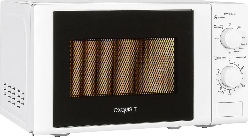 Kombi-Mikrowelle, 20 l Garraum, Auftauprogramm, Grill, 700 Watt Mikrowellen-Leistung, 1.000 Watt Grill-Leistung, 5 Leistungsstufen, mechanische Steuerung, Timer, Drehteller, 25,5 cm Durchmesser, Breite: 43,9 cm, Höhe: 25,8 cm, Tiefe: 32,3 cm