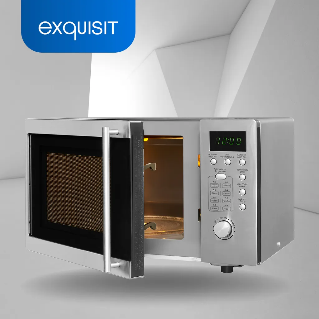Die UMW 800 G-3.1 Inox mit der Gehäusefarbe Silber ist eine Unterbau-Mikrowelle aus dem Hause Exquisit und überzeugt mit vielfältigen Funktionen. Sie besitzt eine Front in der Farbe Inox/Glas und bietet einen Garraum von 20 Liter. Durch Ihre freistehende Bauform kann die Mikrowelle überall ohne Probleme aufgestellt werden. Sie braucht nur einen Stromanschluss. Alternativ besitzt das Gerät die Möglichkeit zur Unterbau-Montage. Das Gerät hat die Abmessungen 28,9 x 46,1 x 34,0 cm (Höhe/Breite/Tiefe). Die Mikrowelle bietet eine Gesamtleistung von 800 W, die Sie in 5 Stufen regeln können. So sind Sie für jede Gegebenheit bestens gerüstet. Die Grillfunktion sorgt mit maximal 1000 W dafür, dass Ihre Speisen knusprig und kross werden. Hierdurch wird das Aufbacken oder Bräunen von Speisen zum Kinderspiel. Die Mikrowelle bietet erwartungsgemäß einen Timer (digital). Mit diesem behalten Sie die Restlaufzeit Ihres Programmes immer im Blick. Für eine gleichmäßige Erwärmung Ihrer Speisen sorgt der integrierte Drehteller. Die Unterbau-Mikrowelle UMW 800 G-3.