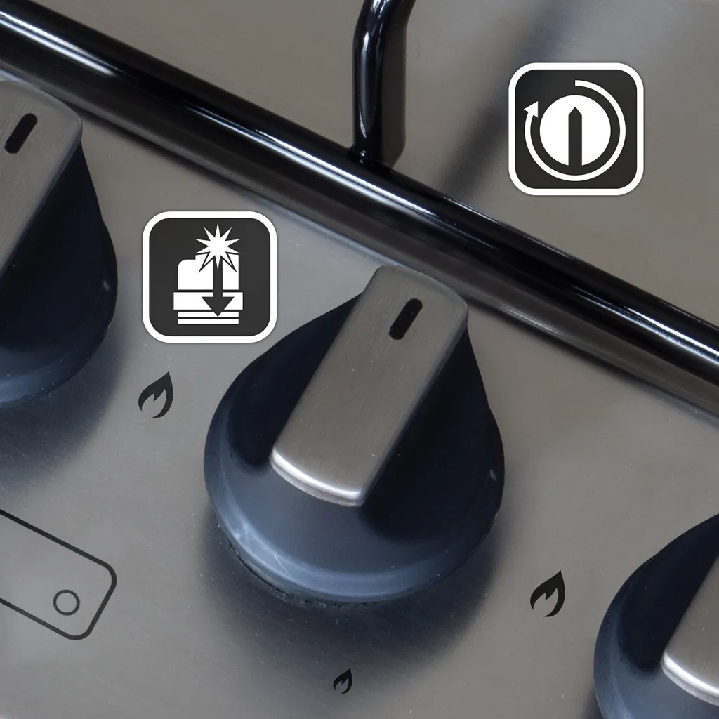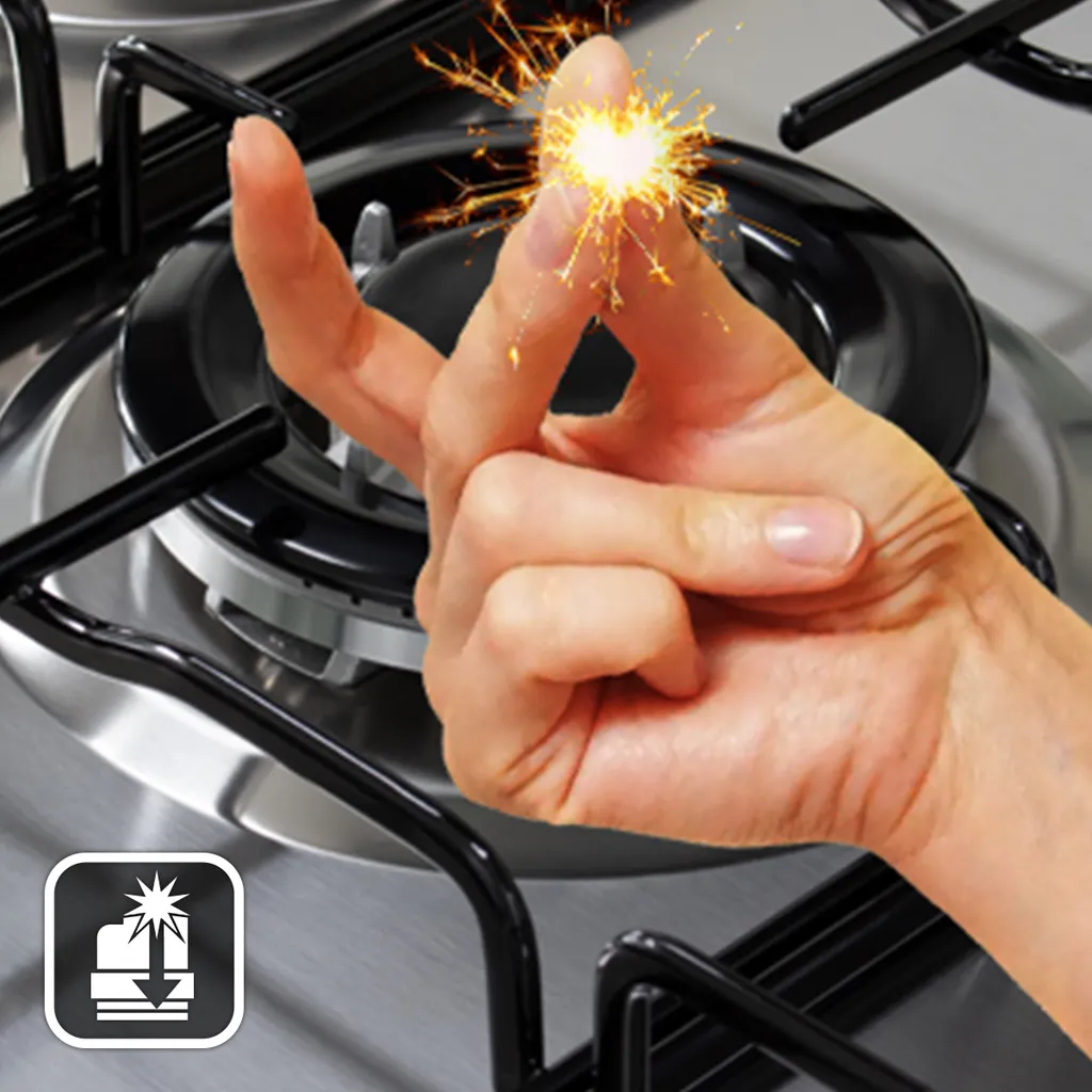 Das Kochfeld bietet auf allen Zonen eine Einhand-Taktfunken-Zündung. Diese erzeugt automatisch beim Eindrücken und Drehen des Knebels einen Funken und die Stelle wird entflammt. Erlischt die Flamme, stoppt die Flammenausfallsicherung den Gasfluss durch ein Sicherheitsventil.
