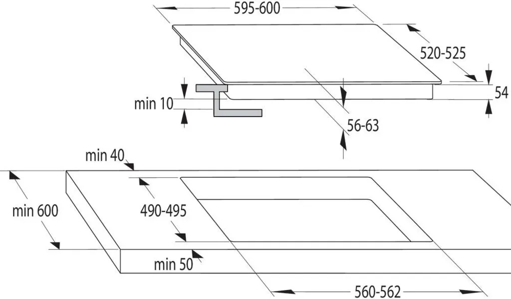 - Breite des Installationsgehäuses des Kochfelds: 56 cm