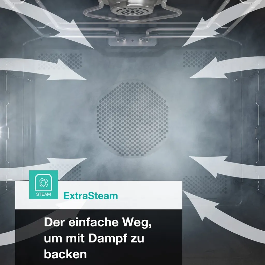 ExtraSteam – Die einfachere Art Brot zu backen: Das ExtraSteam-Programm sorgt für die optimale Dampfentwicklung, wodurch die ideale Luftfeuchtigkeit im Backofen entsteht und Sie immer perfekte Backergebnisse erhalten. Einfach etwas Wasser in ein Backblech gießen, das ExtraSteam-Programm auswählen und die Zeit mit Ihren Liebsten genießen. Ihr Backofen erledigt den Rest.