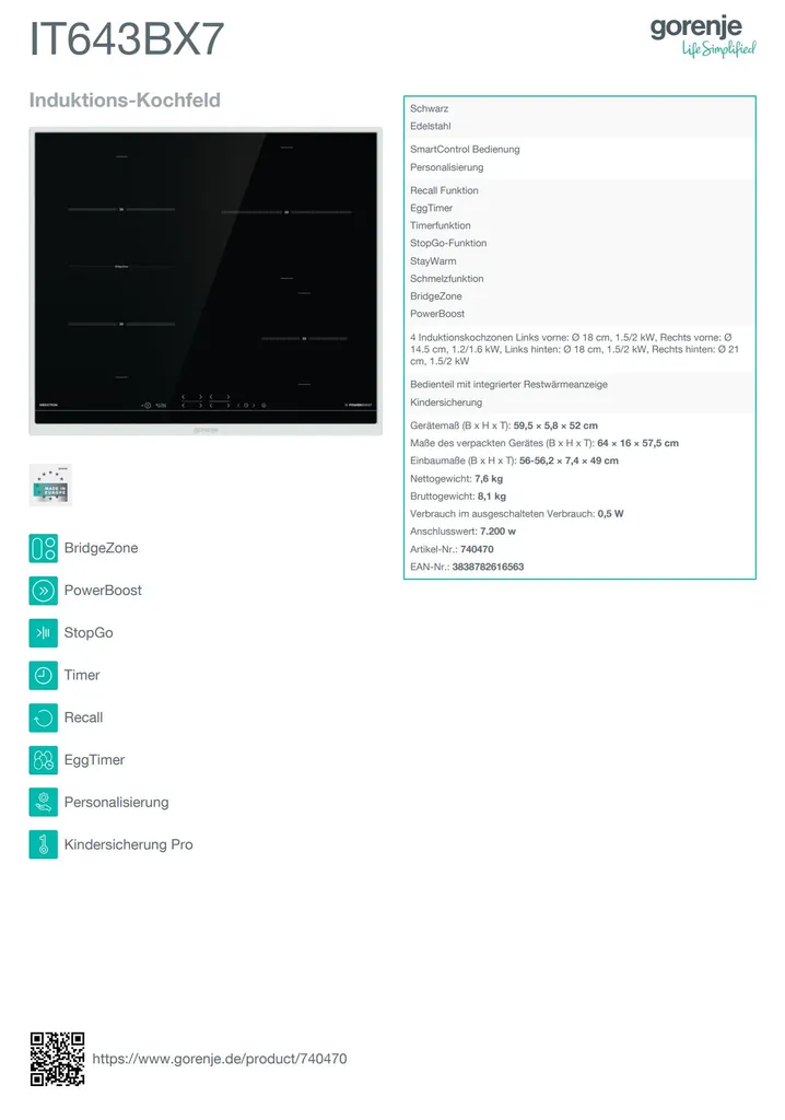 Gorenje EB-Autark-Kochfeld Indukt. IT 643 BX7: weitere Details
