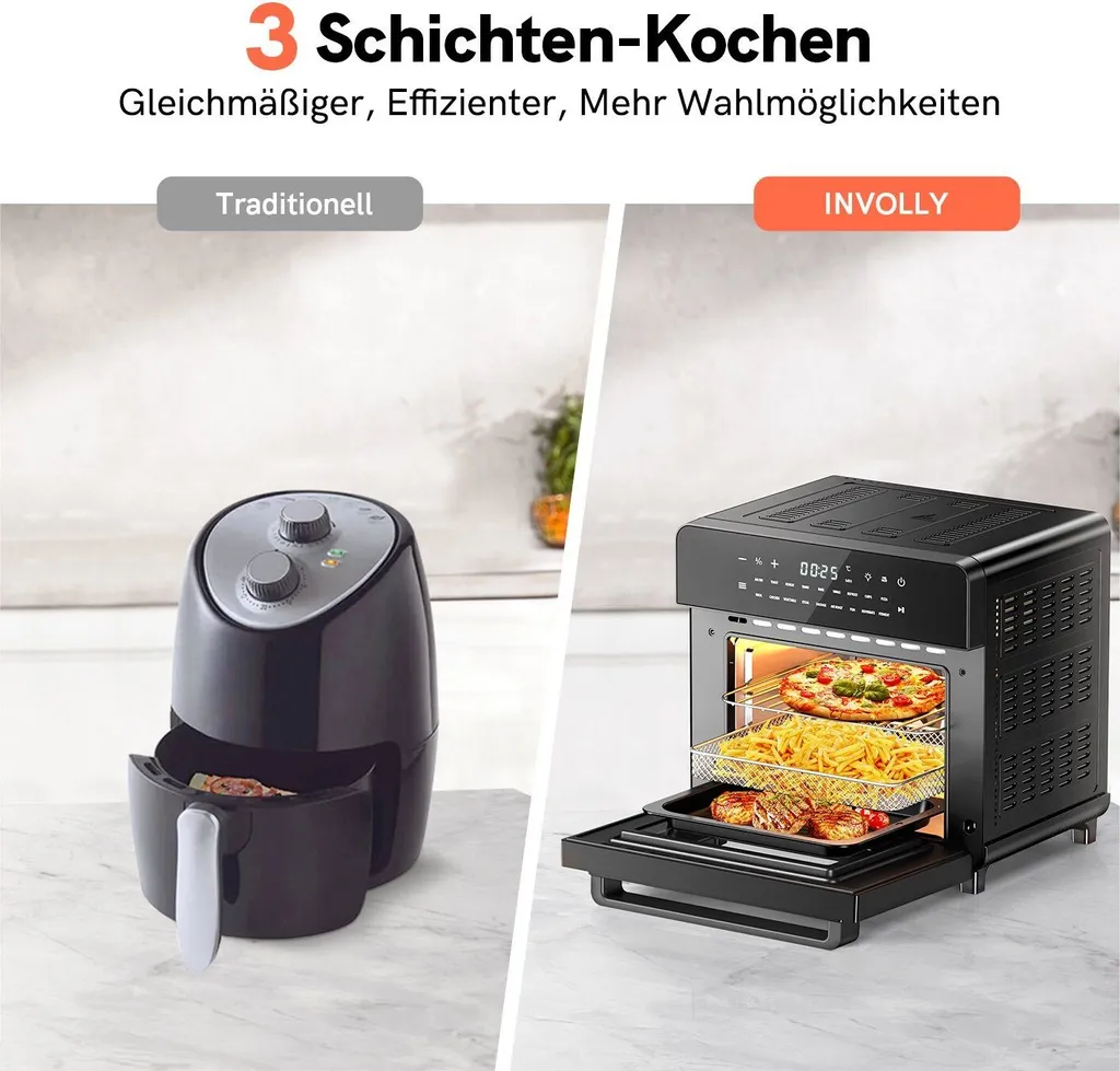 15L MIT 3 SCHICHTEN: 3X größer als die meisten Fritteusen, und mit der 3-Schicht-Struktur kann alles gleichmäßig in einem Durchgang gegart werden. Sie können problemlos ein 2,5kg schweres Hähnchen braten, 500g Kartoffelchips frittieren oder eine 10-inch-Pizza backen. Sie hat die perfekte kompakte Größe für Singles, Paare, Familien, Camping, Partys oder Wohnmobilreisen.