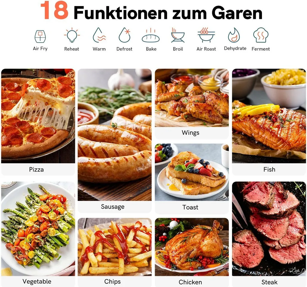 18 VERSATILE MODI: Dieser Mini Backofen verfügt über 18 Voreinstellungen (Air Fry, Broil, Air Roast, Bake, Chips, Pizza, Chicken usw.), mit denen Sie Ihre Lieblingsgerichte einfach und mühelos zubereiten können, von knusprigen Kartoffelchips bis zu saftigen Brathähnchen. Ein Gerät für mehrere Zwecke, das die Kochroutine vereinfacht und gleichzeitig Geld, Zeit und Platz spart.