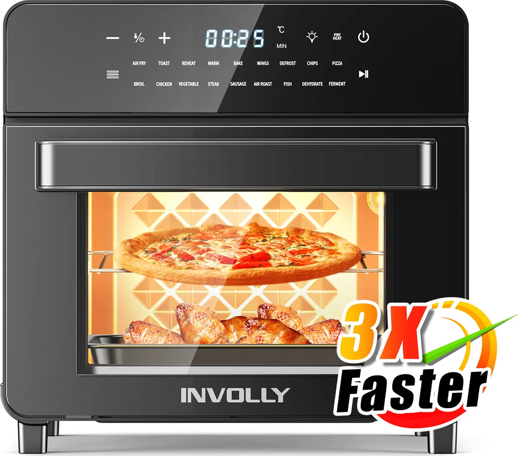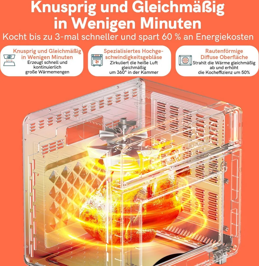 60% ENERGIESPAREN: Dank der 1600W Heizröhre und dem speziellen Hochgeschwindigkeitsgebläse wird die Kochgeschwindigkeit um das 3-fache erhöht. Vor allem mit der rautenförmigen, diffusen Oberfläche können die Lebensmittel gleichmäßig auf allen Seiten mit 90% weniger Öl als bei herkömmlichen Friteusen erhitzt werden. Es ist die perfekte Ergänzung für Ihre Küche.