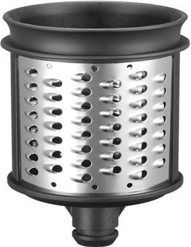 Wird einfach an der von der Küchenmaschine angetriebenen Zubehörnabe angebracht Schnelles und einfaches Schneiden und Raspeln. - Sechs Schnellwechseltrommeln