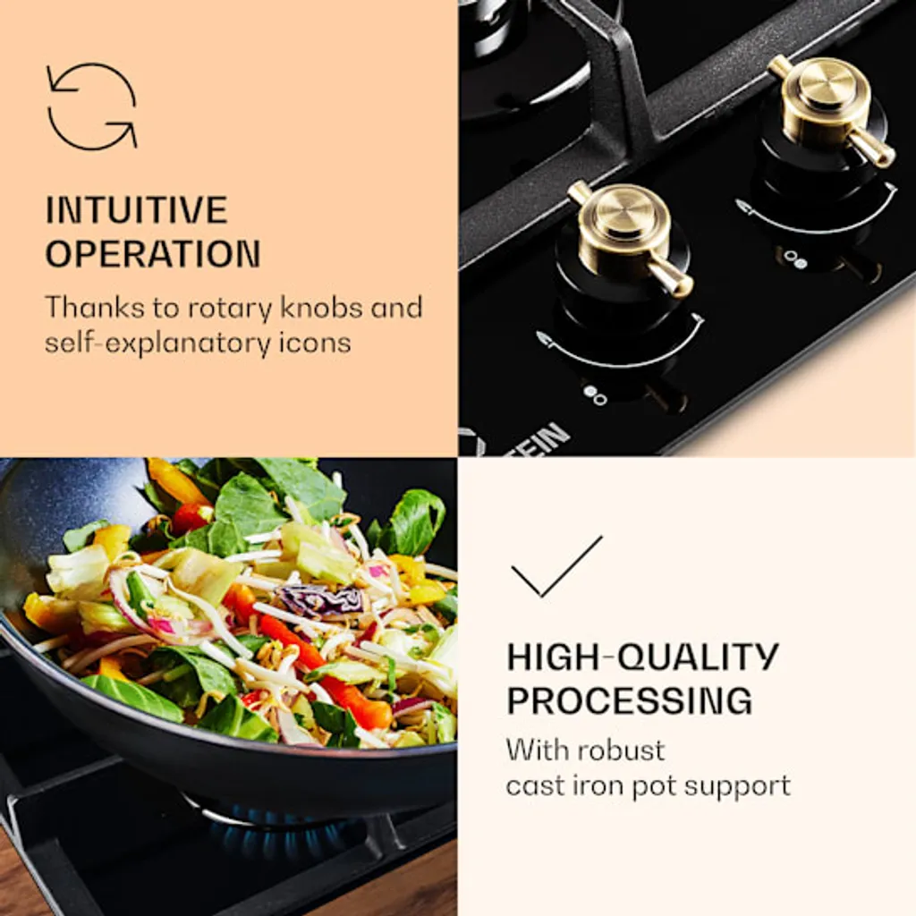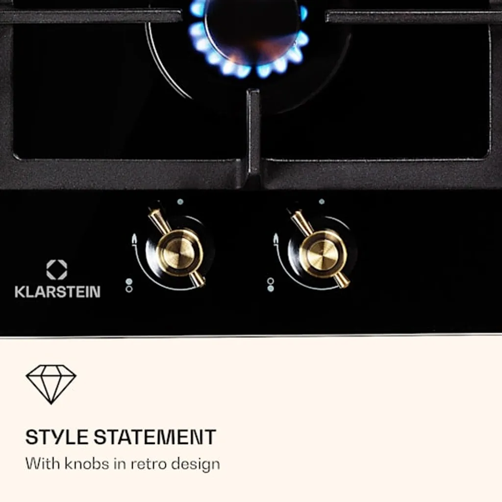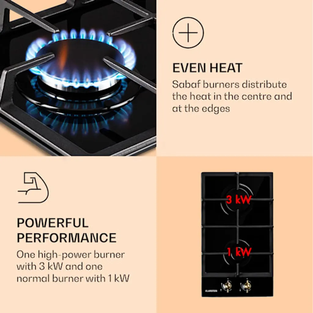 Auf dem platzsparenden Klarstein Victoria Domino Gaskochfeld befinden sich zwei hochwertige Sabaf-Brenner, die mit einer Leistung von 3 kW und 1 kW ordentlich einheizen. Die Brenner verteilen die Hitze gleichmäßig in der Mitte und an den Rändern deines Kochgeschirrs, so wird alles perfekt gegart. Die Bedienung ist dank der selbsterklärenden Symbole an den großen im Retro-Design gestalteten Drehknöpfen absolut intuitiv, die Hitzezufuhr kann während des Kochvorgangs immer wieder direkt angepasst werden. Via SnapJetIgnition entzündest du die Flamme, somit ist kein zusätzliches Feuer nötig. Das abnehmbare Kreuz aus massivem Gusseisen sitzt passgenau und kippsicher über den Flammen. Das Kochfeld ist mit einer gehärteten, pflegeleichten Keramikglas-Beschichtung versehen, die nicht nur gut aussieht, sondern auch besonders leicht zu reinigen ist.