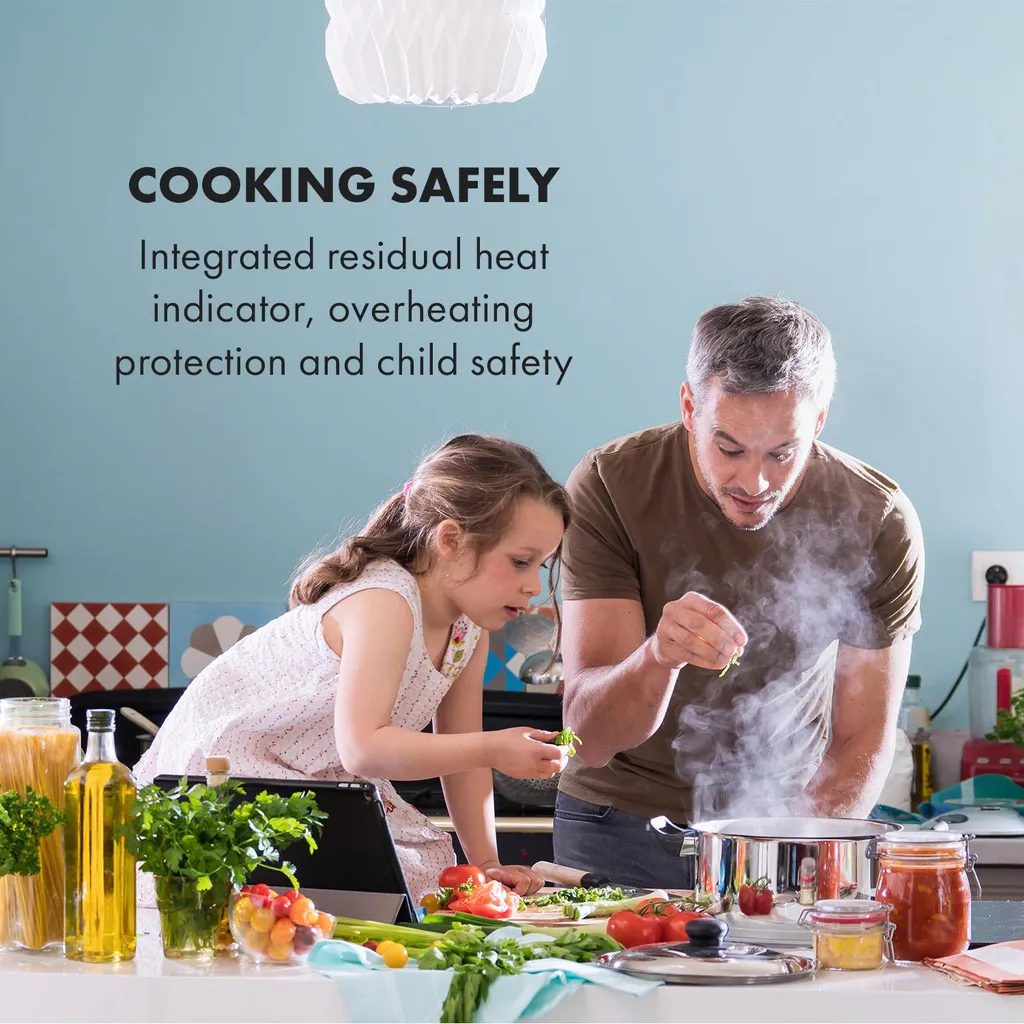 – Sicher kochen: integrierte Restwärmeanzeige, Überhitzungsschutz und Kindersicherung