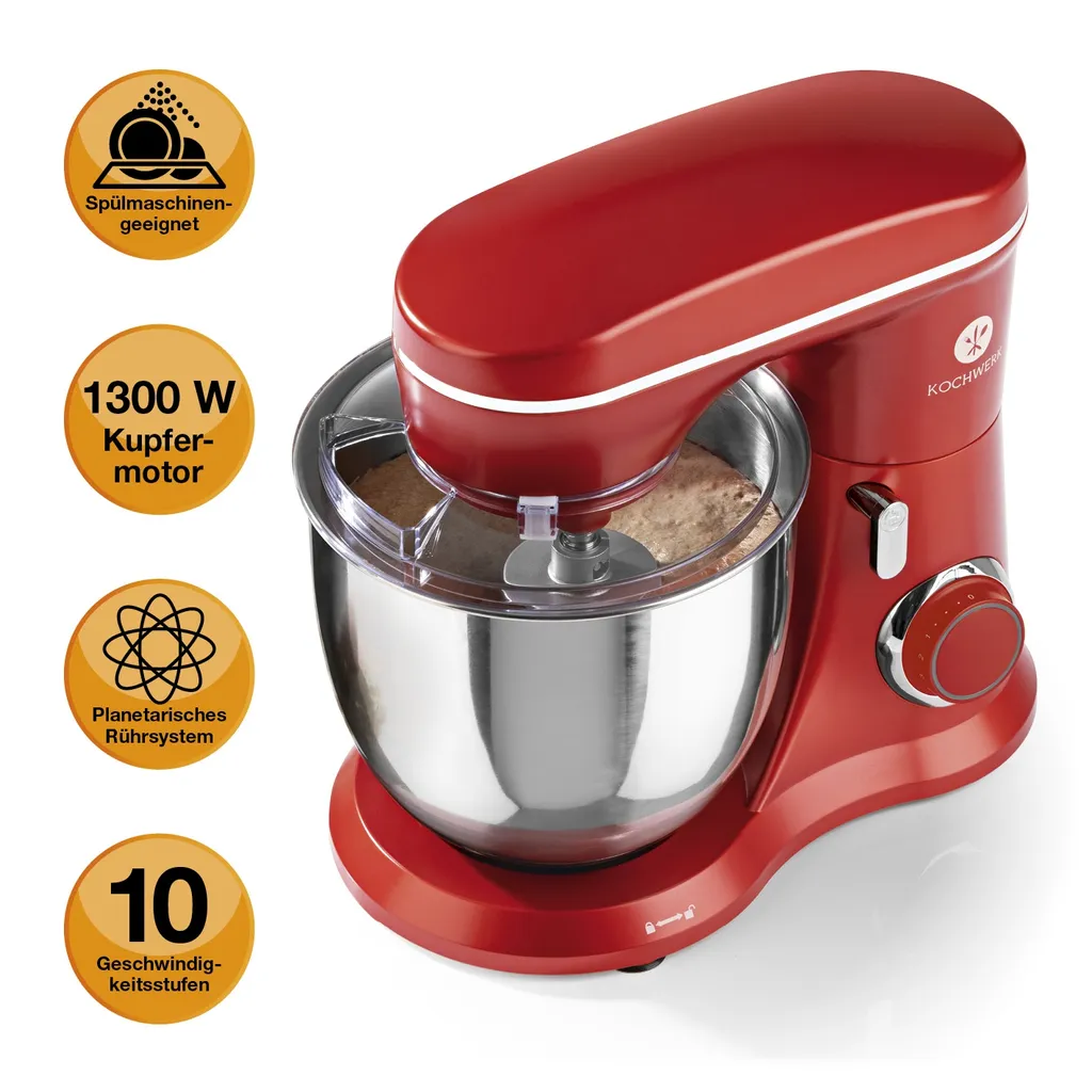 Die Kochwerk Küchenmaschine ist dank des integrierten 1300 Watt Kupfermotors Ihr leistungsstarker und langlebiger Begleiter in der Küche. Egal, ob für Kuchen- und Keksteige, Sahne, Baiser oder sogar schwere Teige – mit den 10 verschiedenen Geschwindigkeitsstufen und dem planetarischen Rührsystem werden die Ergebnisse gleichmäßig und geschmeidig.