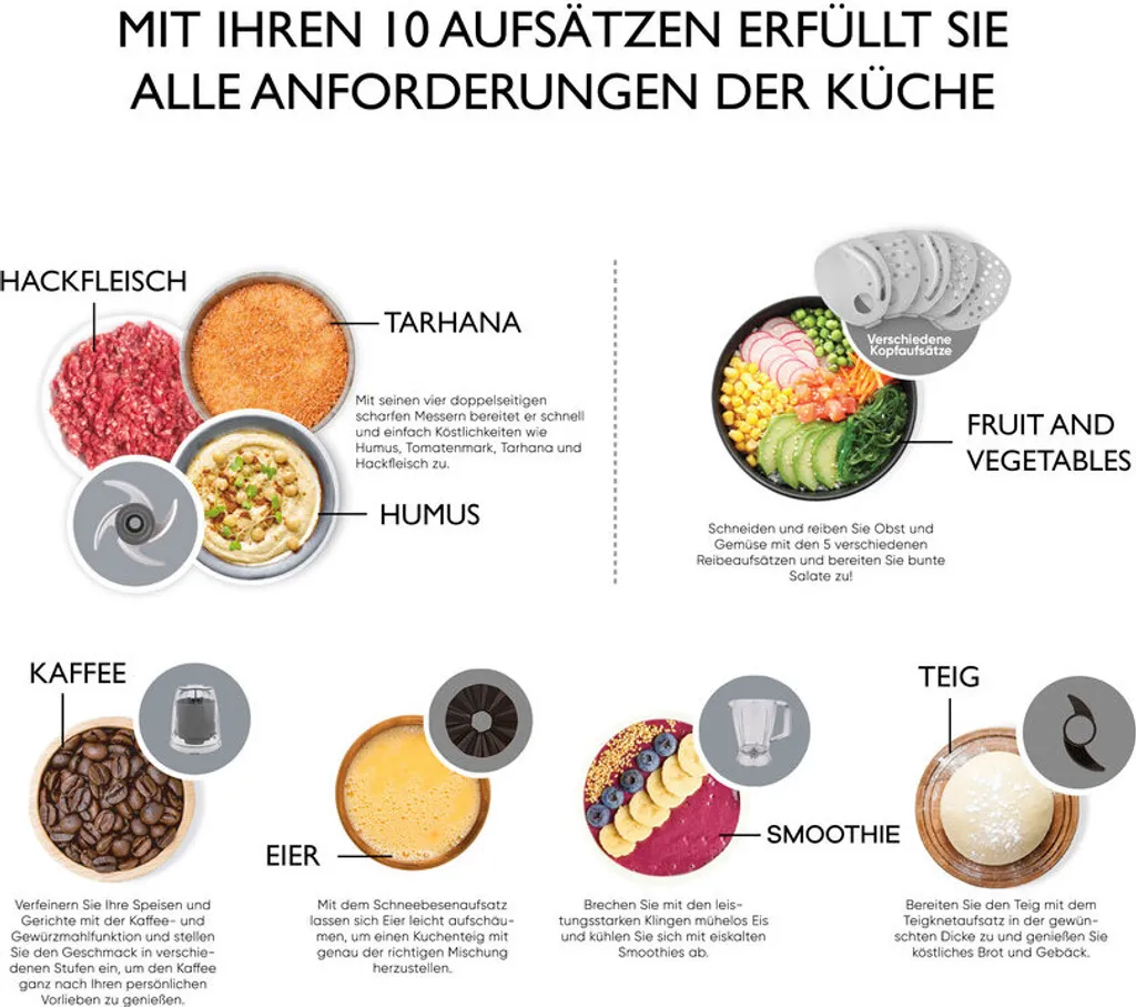 - Mit dem Mahlwerk können Sie Kaffee und Gewürze in verschiedenen Stufen mahlen, ganz nach Ihrem Geschmack. Doppelstöckige 4-Klingen-Zerkleinerungsmesser sorgen für eine hohe Zerkleinerungsleistung. So können Sie schnell Lebensmittel wie Hummus, Tomatenmark, Hackfleisch und Tarhana
