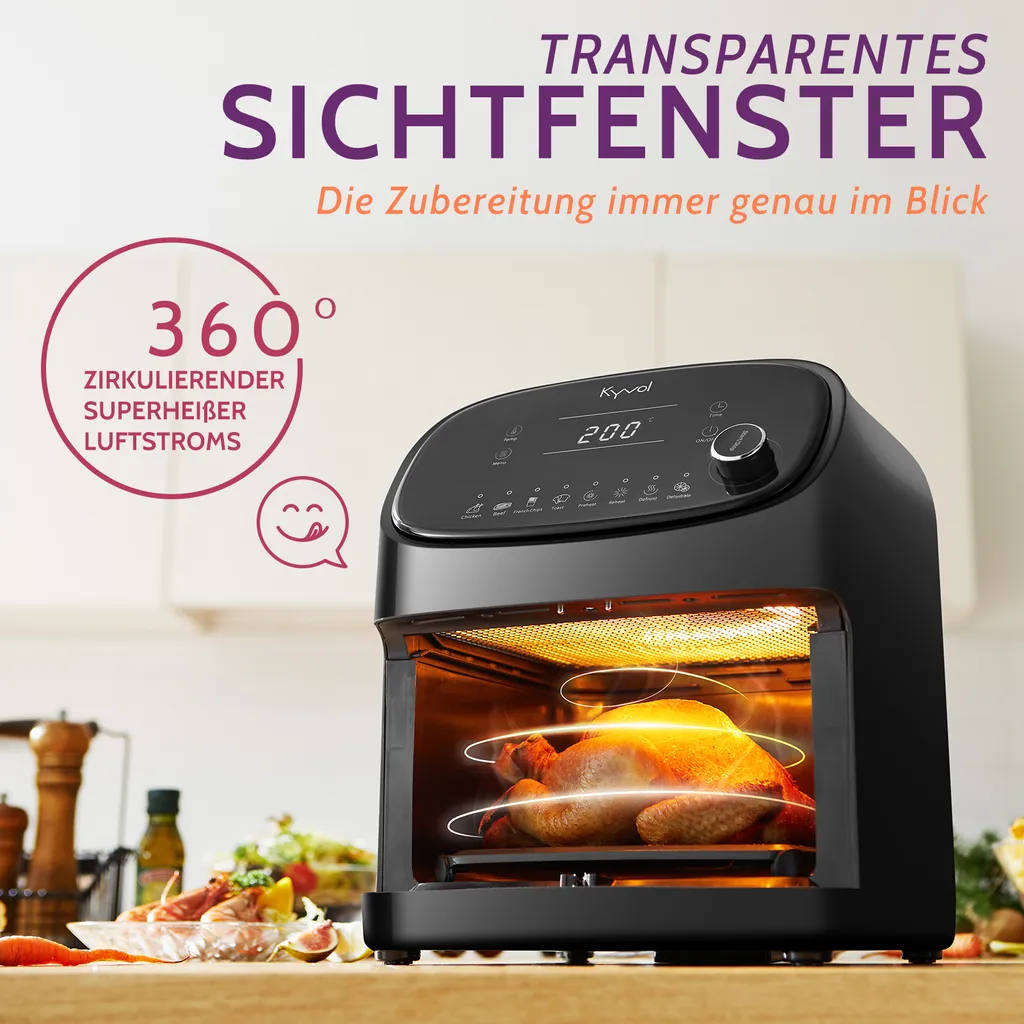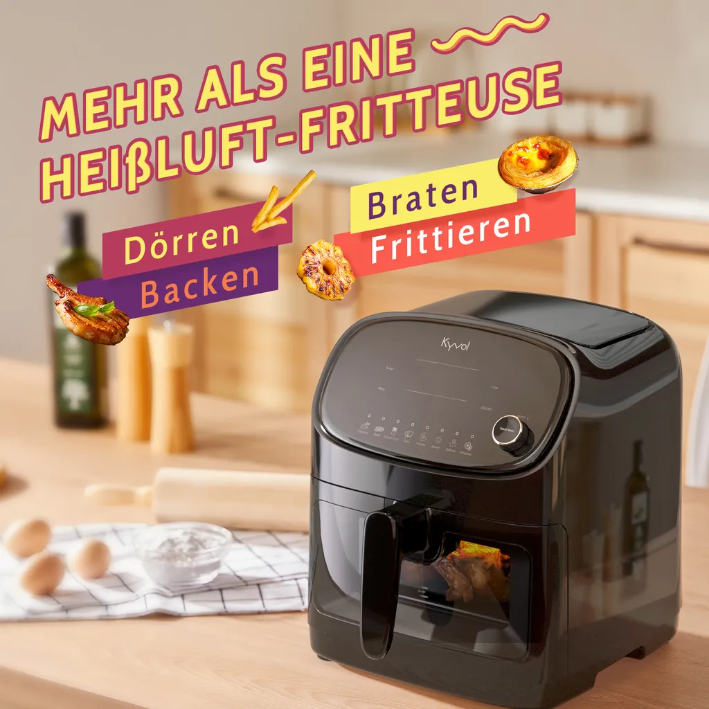 Die Airfryer KYVOL AF60 mit 360°-Heißluftstrom-Technologie revolutioniert das bewährte Prinzip des Frittierens ohne Öl und führt es in neue Höhen des Geschmacks. Die Pommes Frites werden knusprig und das Huhn saftig und reduzieren gleichzeitig das Fettvolumen um 85 %. Ob Pommes Frites oder Frittata, alle Ihre zubereiteten Gerichte, Beilagen und Desserts können in einer elektrischen Fritteuse ohne Öl hergestellt werden. Sie brauchen keinen ganzen Ofen mehr. Kyvol AF60 bringt Ihnen köstliche und einfache Mahlzeiten.