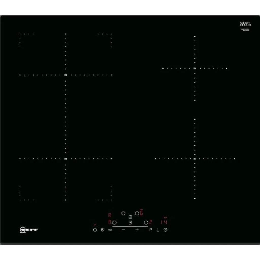 NEFF – TouchControl 60 cm Induktionskochfeld – Digitalanzeige – Abgeschrägte Vorderseite – MultiTouch-empfindliche Bedienelemente – 4 Induktionskochfelder einschließlich 1 CombiInduction-Zone – PowerBoost auf jeder Kochplatte – Ein / Aus-Empfindlichkeitstaste – Neustartfunktion – Schnellstartfunktion – 17 Einstellpositionen – Digitalanzeige der Einstellposition – Restwärmeanzeige – Leistungsschalter-Timer für jeden Kamin
