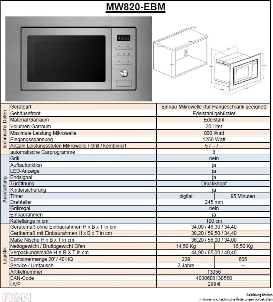 PKM Mikrowelle Einbau MW820-EBM, 20 Liter Garraum