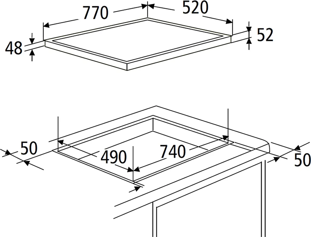 Maße Kochfeld H X B X T in cm: 5,20 x 77,00 x 52,00