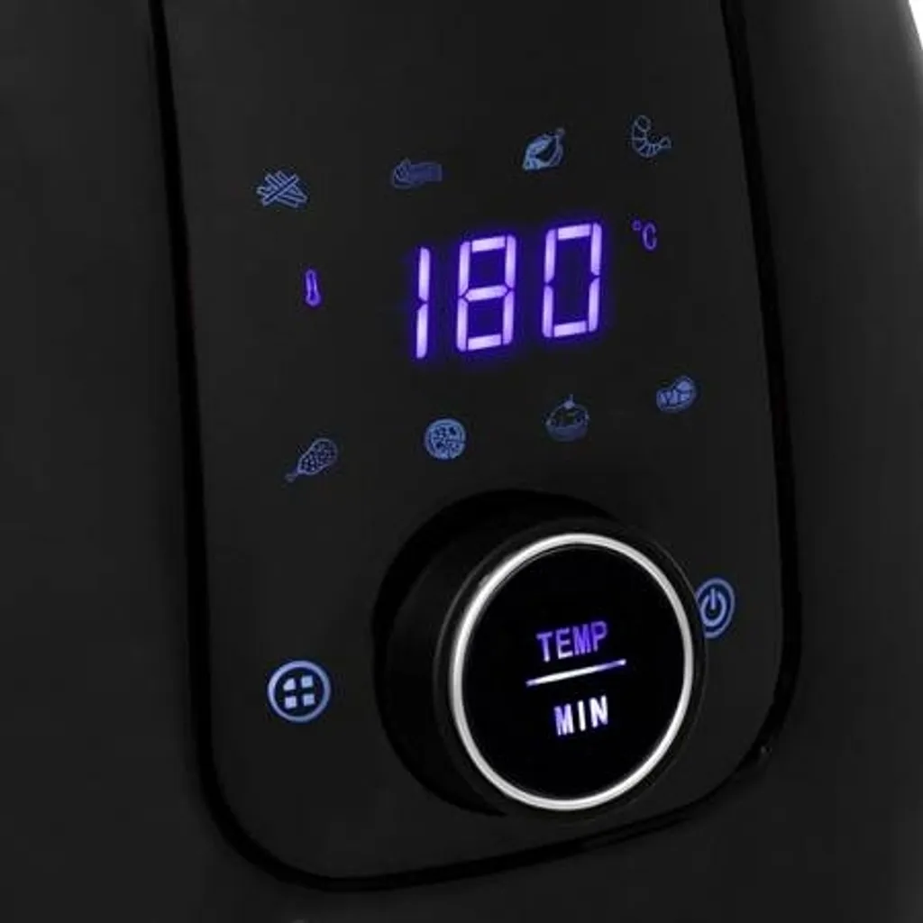 Inhalt 5,2 l, extra großer Korb 24 cm, Frittier-Kapazität 1,5 kg, 7 vorprogrammierte Backprogramme, Temperaturbereich 80-200 °C, Timer Funktion, digitales Bedienfeld, Touchscreen, Schnelle Luftumwälzung, Braten ohne Öl, Griffe mit Hitze-Isolierung, Hitzebeständiges Gehäuse, Antihaftbeschichtung, Leistung 1700 Watt, Schukostecker CEE 7/7
