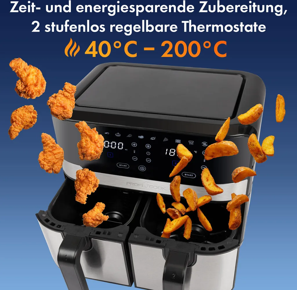 - Doppelter Spaß für die ganze Familie – die ProfiCook Heissluftfriteuse XXL besitzt ein Gesamtvolumen von 9 Litern aufgeteilt in 2x 4,5 Liter Körbe. Die 2 Frittier-Fächer sind separat steuerbar und sorgen dafür, dass die Lebensmittel sich nicht vermischen. In der Fritteuse Heissluft ohne Fett lassen sich so bis zu 1,2kg Pommes gleichzeitig herstellen