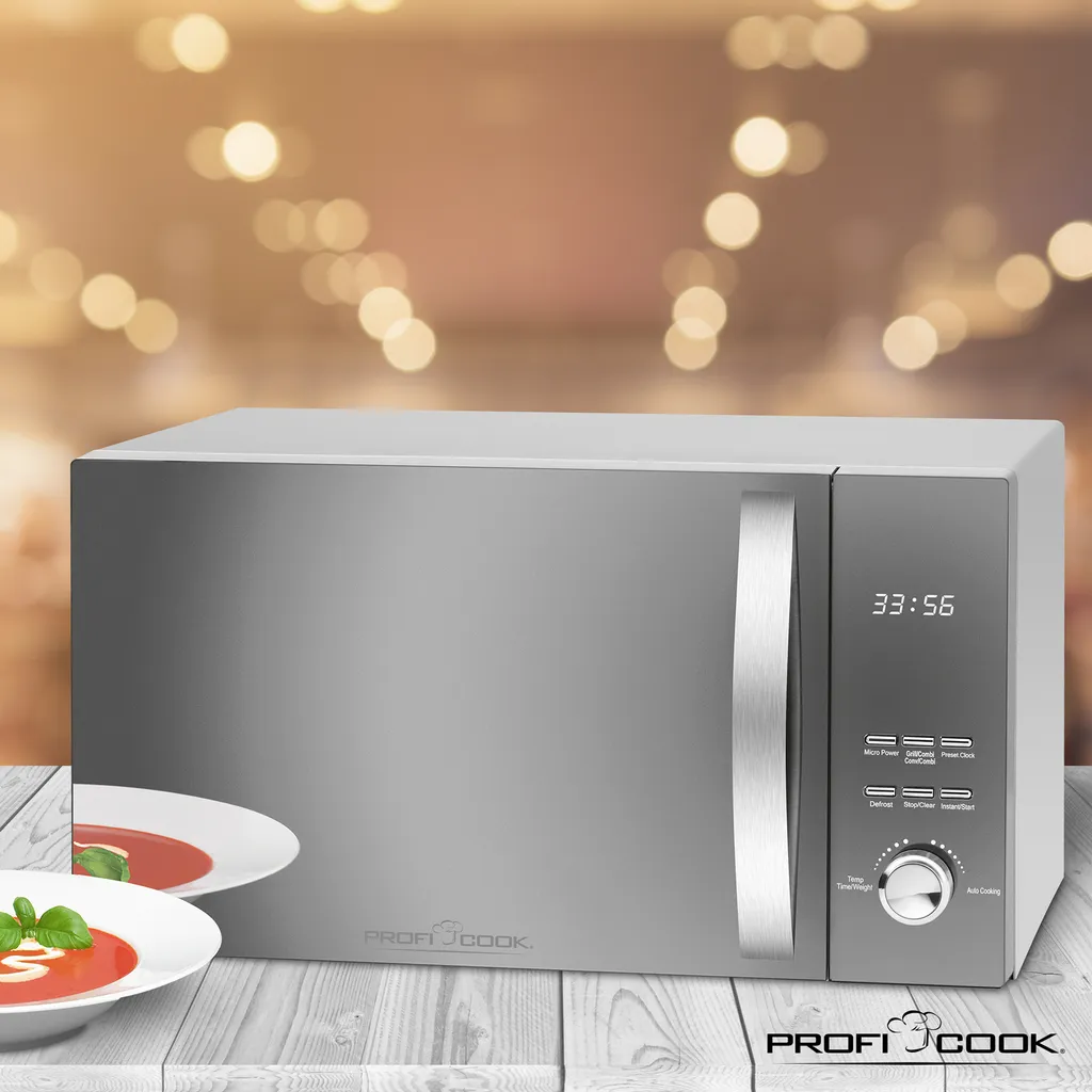 - 3in1 Mikrowelle / Grill / Heißluft — Aus modernen Haushalten ist eine Mikrowelle kaum mehr wegzudenken. Gut, wenn man eine zuverlässige Mikrowelle hat, die schnell Gerichte auftaut, erwärmt, grillt und gart. Die Mikrowelle von ProfiCook vereint die wichtigsten Grundlagen einer effizienten Mikrowelle: individuelle Funktionen mit automatischen Garprogrammen, verlässliche Leistung und gute Verarbeitung.