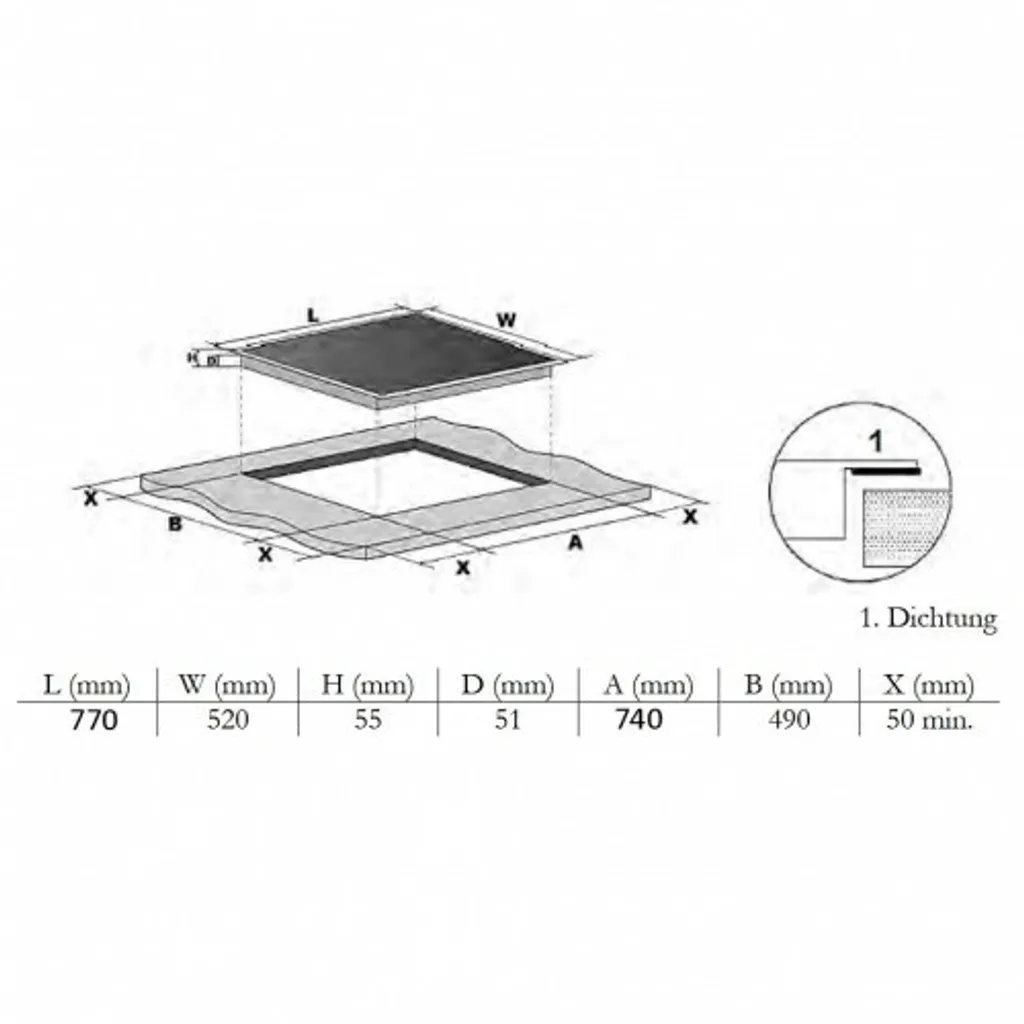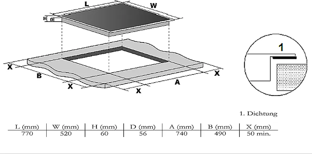 - Maße Kochfeld H x B x T in cm: 6,2 x 77,0 x 52,0