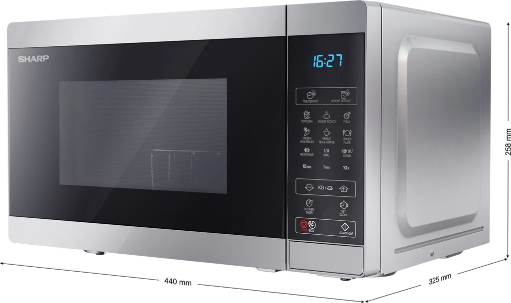 Der Sharp YC-MG02E-S ist mit allem ausgestattet, was ein moderner Mikrowellenherd haben sollte. Neben der Mikrofunktion verfügt es auch über eine Grillfunktion. Rotierende Scheibe, 11 Leistungsmodi, 8 voreingestellte Programme und Abtaumodus mit Gewichtseinstellung. Es ist auch mit einer Timer-Funktion und einer Kindersicherung ausgestattet. Sharp YC-MG02E-S hat auch einen Knopf für Popcorn.