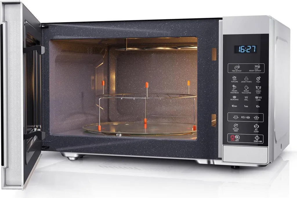 900 Watt Mikrowellenleistung: Erhitzen Sie Nudeln, Kartoffeln, Suppen, Eintöpfe und Fertiggerichte besonders schnell oder nutzen Sie die 1.100 Watt Grillfunktion und bereiten knusprig, goldbraun gegrilltes Geflügel oder Fisch zu. Das Gerät verfügt zusätzlich über eine praktische Auftaufunktion mit der Sie die Möglichkeit haben tiefgekühlte Lebensmitteln wie Fisch, Geflügel, Brot oder Früchte schonend und schnell aufzutauen.