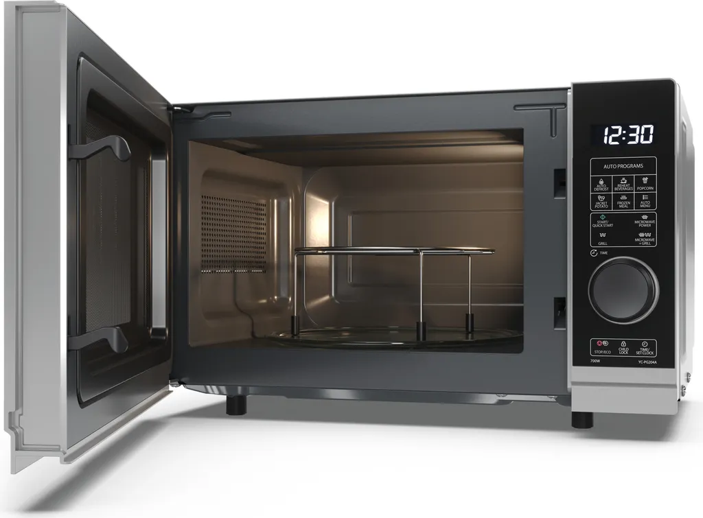 - Mit der silberen Oberfläche und dem eleganten grifflosen Design sticht diese Mikrowelle in der Küche besonders hervor. Mit einem Fassungsvermögen von 20 Litern können Sie ganz einfach und schnell Speisen für mehrere Personen zubereiten.