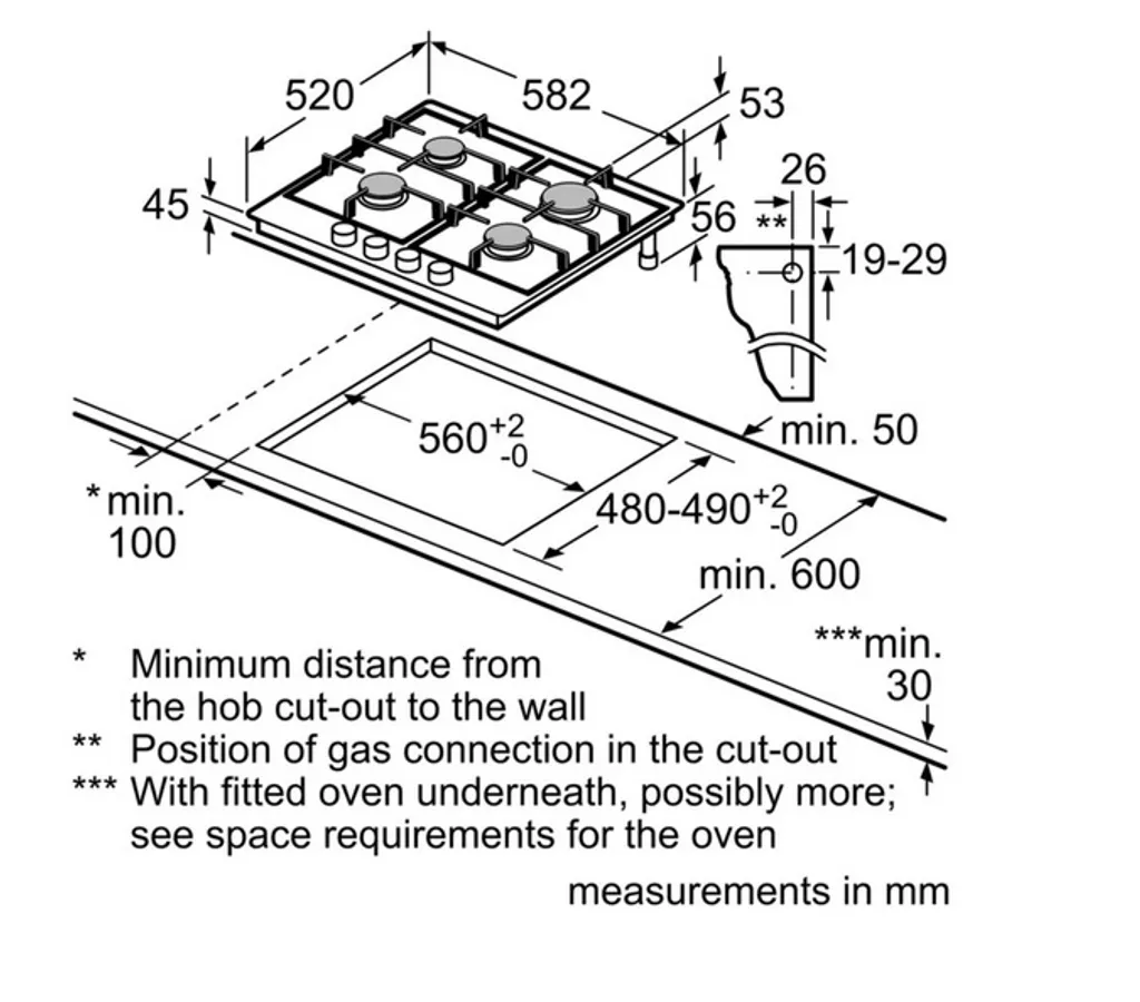 Maße des Kochfeld: 45 x 582 x 520 mm