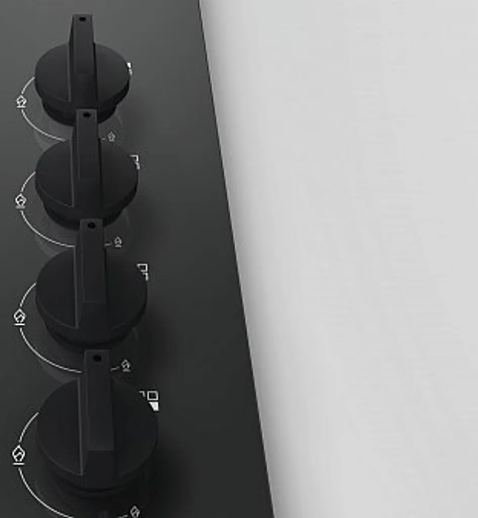 Gaskochfeld – Linie IQ100 – 4 Brenner, davon 1 schnelles 3 kW – In die Hebel integrierte Zündung – Gassicherheit durch Thermoelement – Verglaste Einfokusgitter.