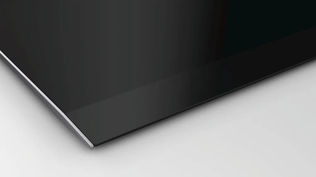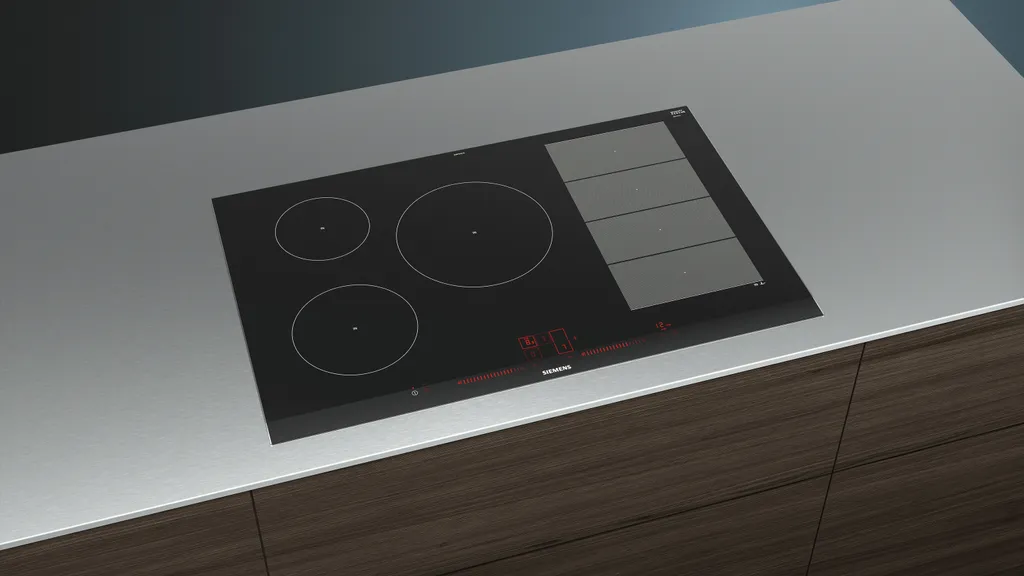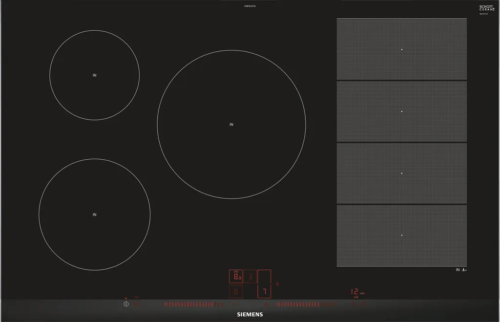 Siemens EX875LVC1E. Produktfarbe: Schwarz, Edelstahl, Geräteplatzierung: Integriert, Kochfeldtyp: Zonen-Induktionskochfeld. Schmorplatte/ Kochzone: 2200 W, Standard Herdplatte/Kochzone: 3100 W, Große Herdplatte/Kochzone: 3700 W. Steuerung: Berührung, Steuerungsposition: Vorderseite. Anschlusswert (elektrisch): 7400 W, AC Eingangsspannung: 220-240 V, AC Eingangsfrequenz: 50 – 60 Hz. Breite: 812 mm, Tiefe: 520 mm, Höhe: 51 mm