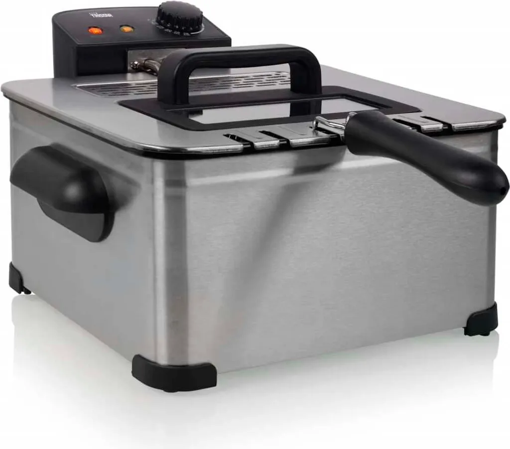 Die Doppel Fritteuse ist dank ihres verstellbaren Thermostats, das Sie mit einem Drehknopf auf bis zu 190? C einstellen können, einfach zu bedienen. Dank ihrer 2000 Watt Leistung heizt sie in kürzester Zeit auf! Das praktische Sichtfenster bietet Ihnen die Möglichkeit, Ihre Pommes zu kontrollieren, ohne den Deckel abzunehmen. Also müssen Sie sich keine Gedanken über Ölspritzer machen.