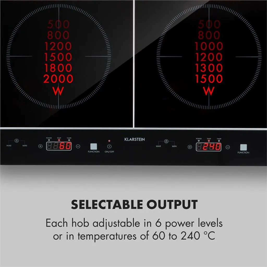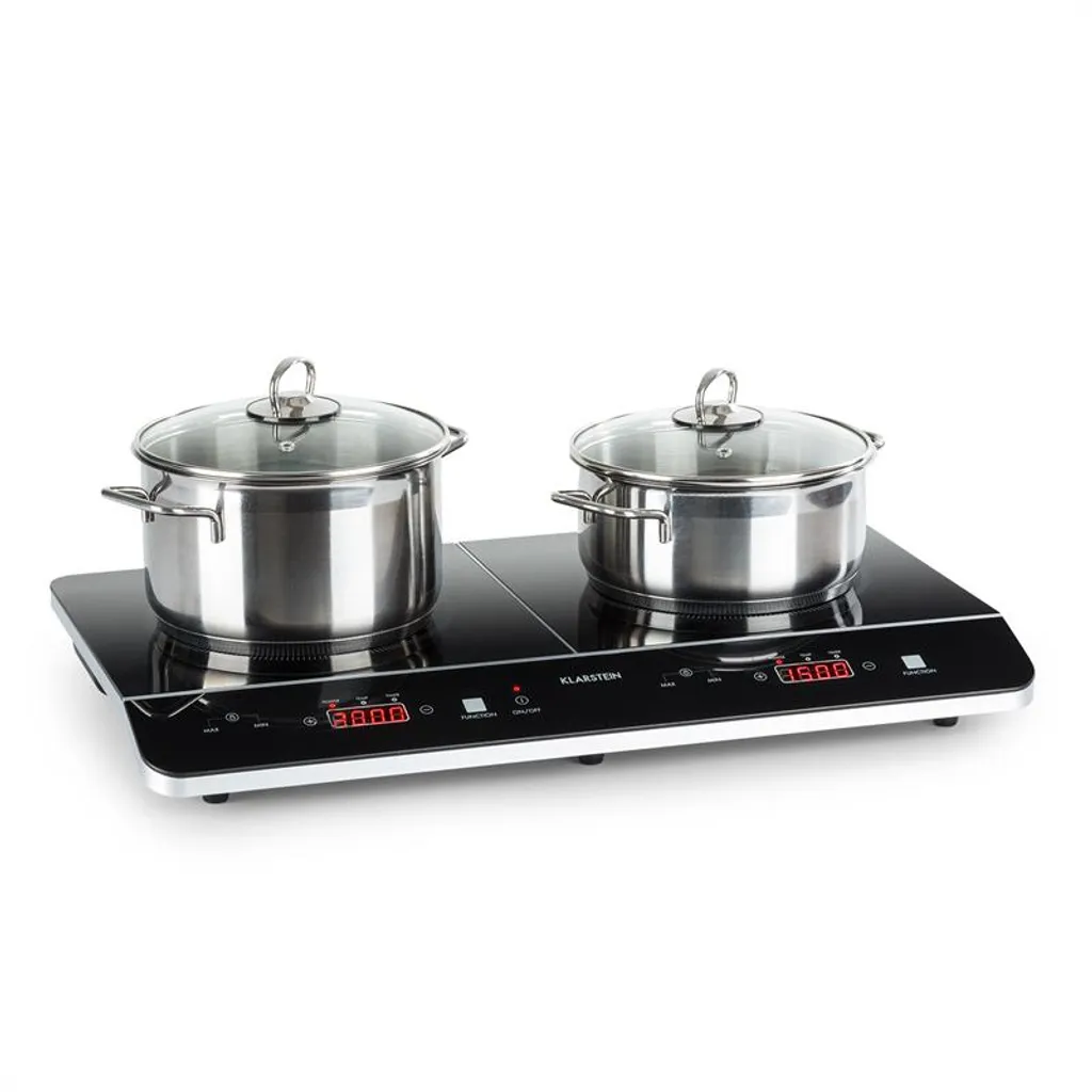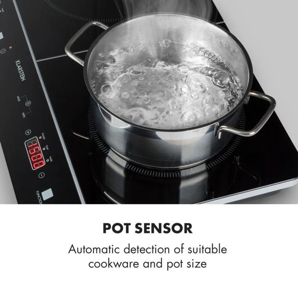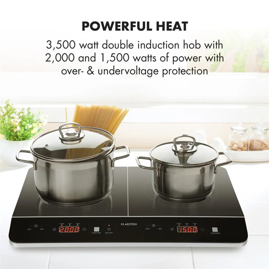 Kraftvolle Hitze: 3500 Watt starkes Doppel-Induktionskochfeld mit 2000 bzw. 1500 Watt Leistung mit Über- & Unterspannungsschutz, Wählbare Leistung: jedes Kochfeld mit 6 Stufen sowie einstellbaren Temperaturen von 60 bis 240 °C, Sehen & Fühlen: edle, schwarze Glaskeramik-Oberfläche mit SenseControl-Touchfeld zur einfachen Bedienung, Topfsensor: automatische Erkennung von geeignetem Kochgeschirr und Topfgröße, Auf die Minute: einstellbarer Abschalt-Timer mit 5-Minuten-Schritten für Kochzeiten von 5 bis 180 Minuten, Sicher: einstellbare Kindersicherung gegen versehentliches Bedienen oder Umprogrammiern, Automatik: Überhitzungsschutz und Autoabschaltung nach 2 Stunden für mehr Sicherheit in der Küche